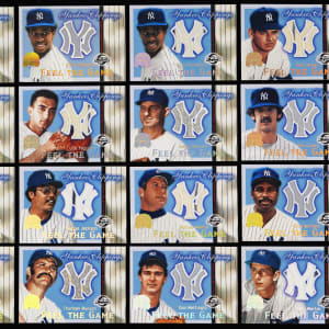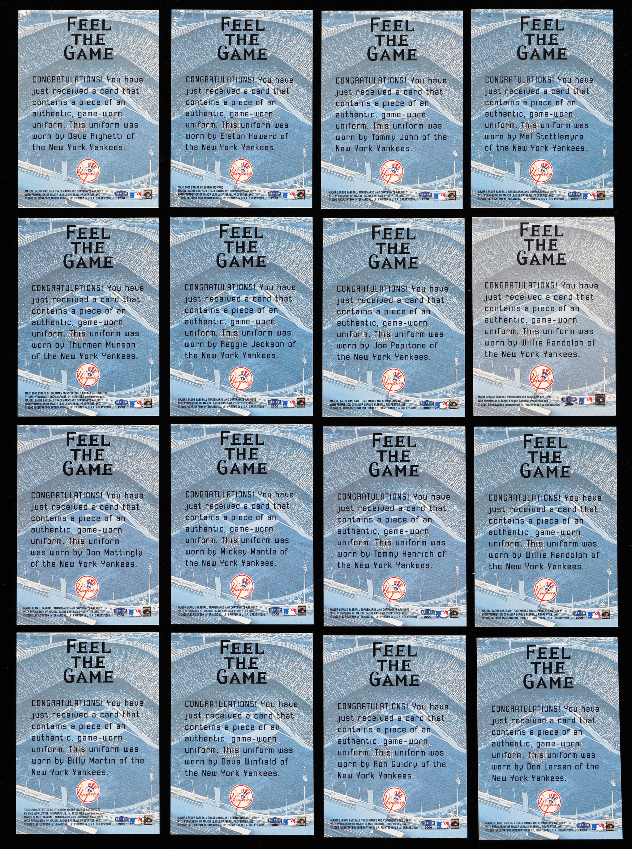 "Feel the game" with the offered 2000 Fleer Greats of the Game Yankees Clippings game-used set of (15) jersey cards plus a duplicate. Seeded 1:48 throughout hobby packs, this pinstriped parade is among the more desirable modern insert sets of the decade. Includes: Guidry, Henrich, E. Howard (surface flaking), R. Jackson, John, Larsen, Mantle, B. Martin, Mattingly, Munson, Pepitone, (2) Randolph, Righetti (slight surface flaking), Stottlemyre and Winfield.