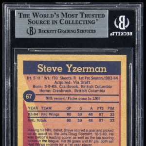 The Captain! Graded NM-MT+ 8.5 by BGS. The offered 1984-1985 O-Pee-Chee Hockey #67 Steve Yzerman rookie card touts the following sub-grades: Centering: 8; Corners: 8.5; Edges: 8.5 and Surface: 9.