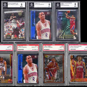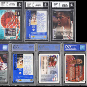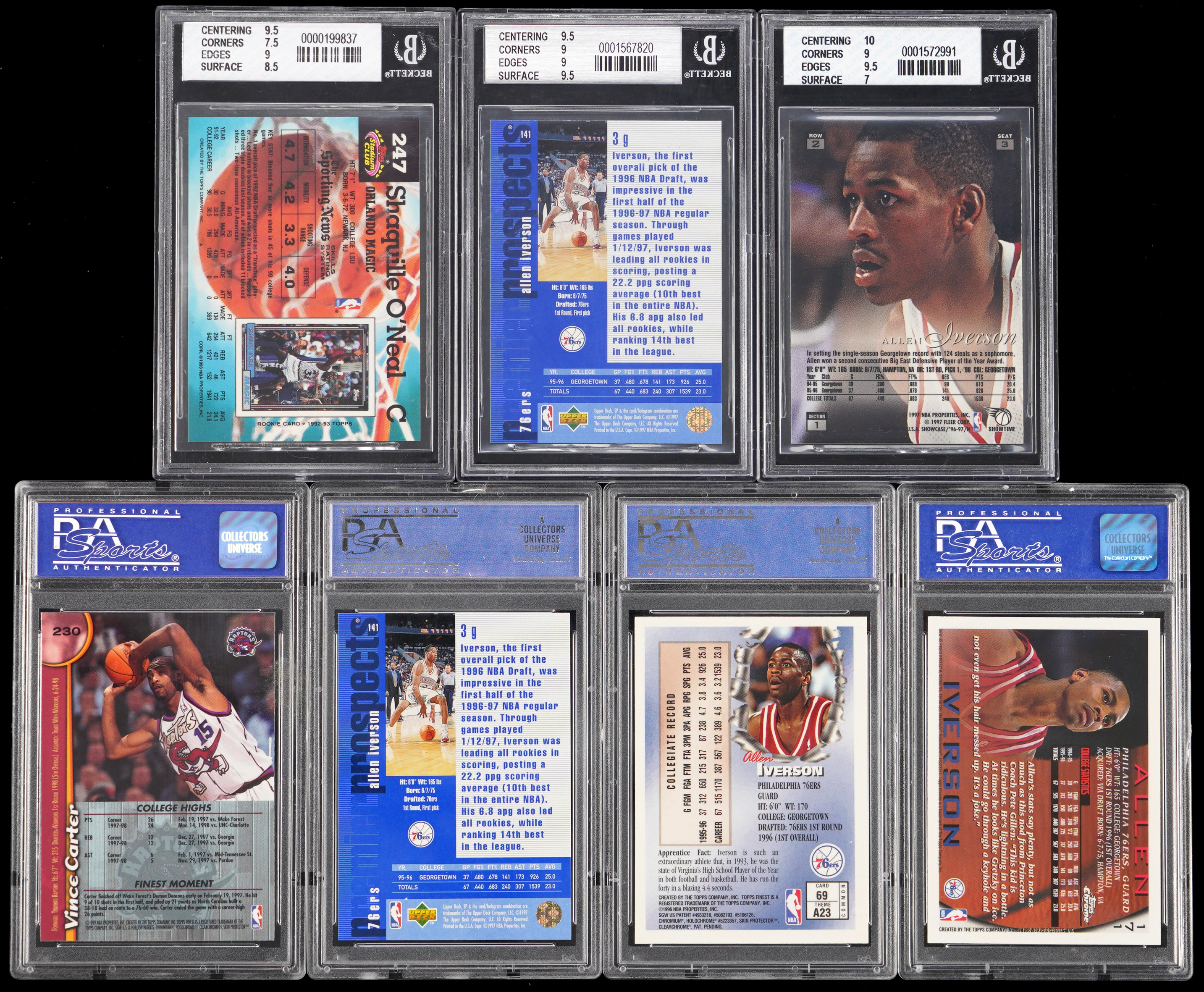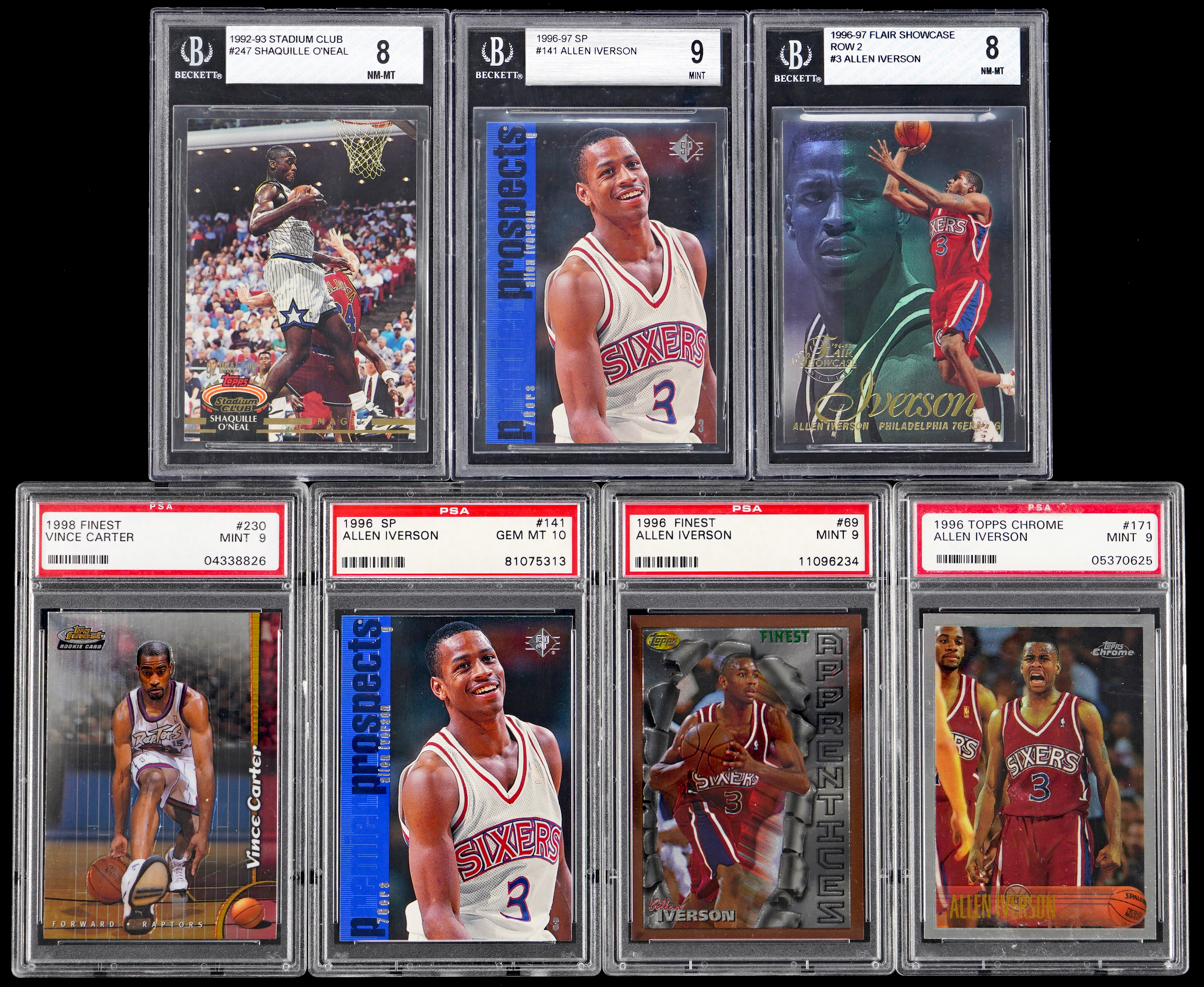"The Answer", "Shaq" and "Vinsanity" dominate the glass with these seven 1992-1999 Basketball Hall of Fame graded rookies. Includes: 1992-1993 Stadium Club #247 O'Neal RC (BGS NM-MT 8), 1996-1997 Finest #69 Iverson RC (PSA MINT 9), 1996-1997 Flair Showcase Row 2 #3 Iverson RC (BGS NM-MT 8), (2) 1996-1997 SP #141 Iverson RC (one PSA GEM MINT 10, one BGS MINT 9), 1996-1997 Topps Chrome #171 Iverson RC (PSA MINT 9) and 1998-1999 Finest #230 V. Carter RC (PSA MINT 9).