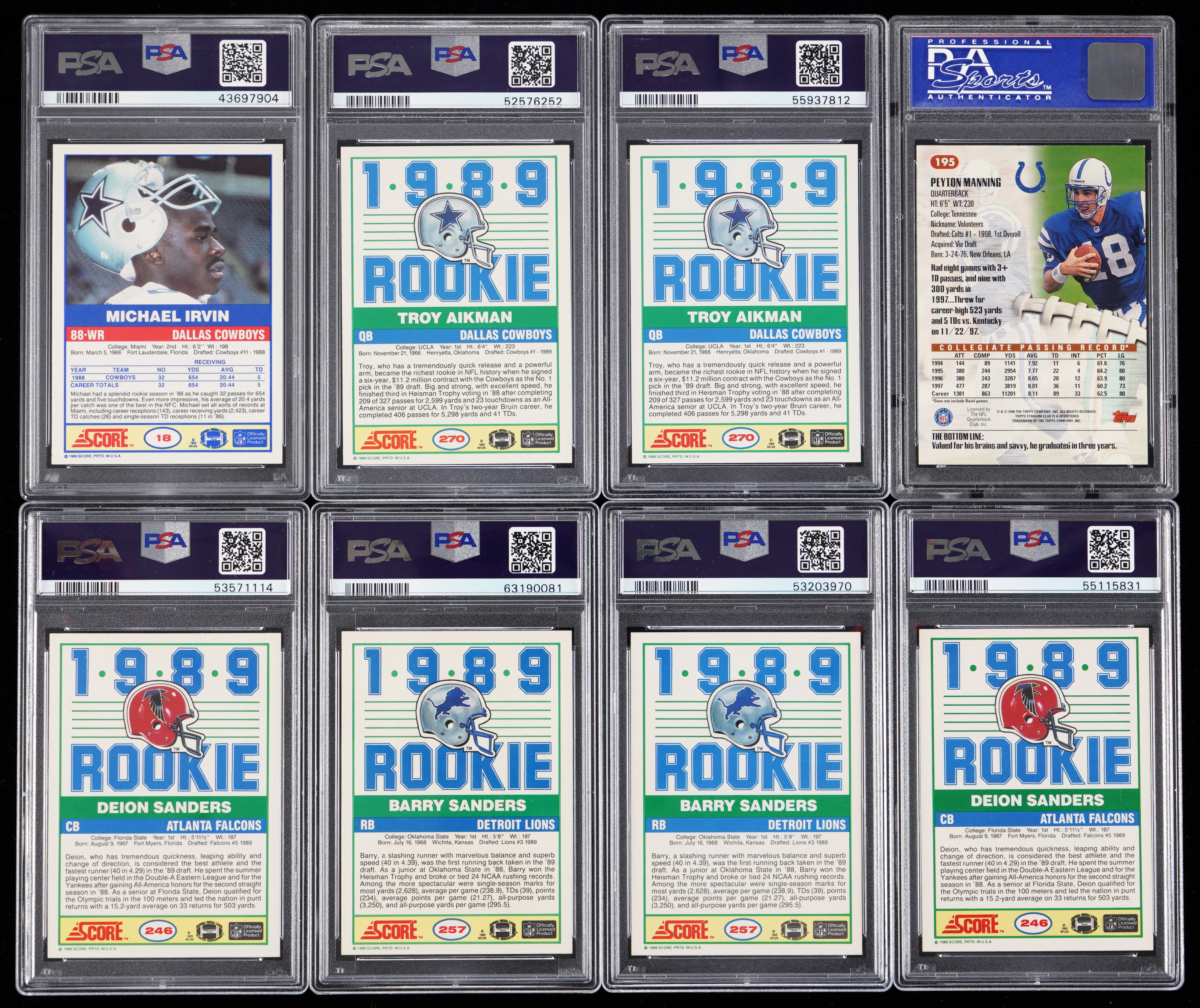 Supercharge your gridiron gallery with these eight 1989-1998 Football Hall of Fame graded rookie cards. Includes: 1989 Score #18 Irvin RC (PSA MINT 9), (2) 1989 Score #246 D. Sanders RC (both PSA NM-MT 8), (2) 1989 Score #257 B. Sanders RC (both PSA MINT 9), (2) 1989 Score #270 Aikman RC (one PSA MINT 9, one PSA NM-MT 8) and 1998 Stadium Club #195 P. Manning RC (PSA MINT 9).