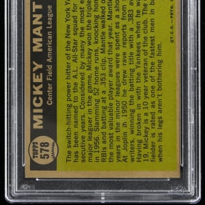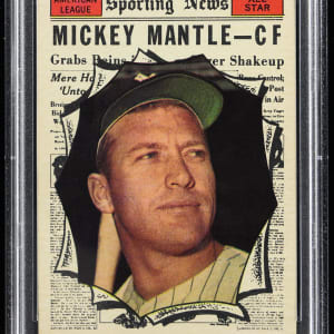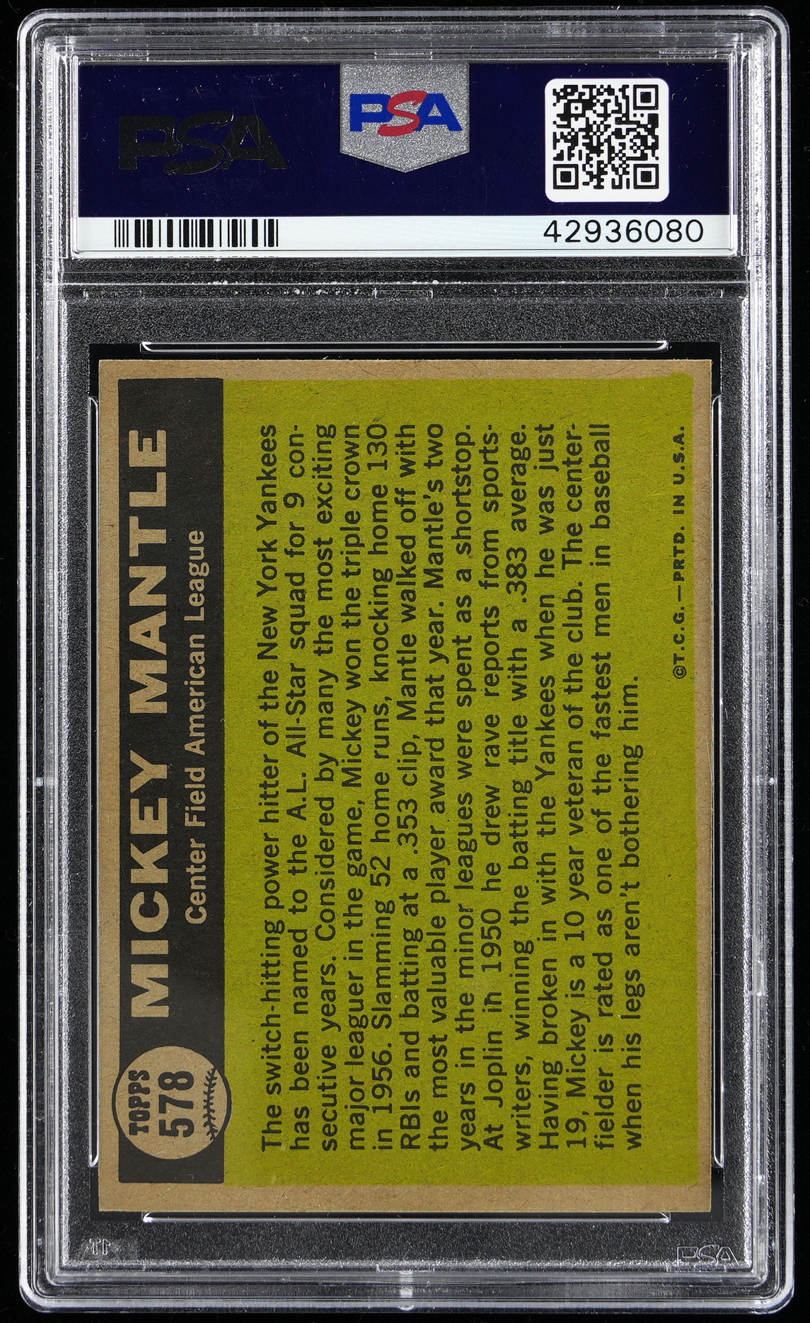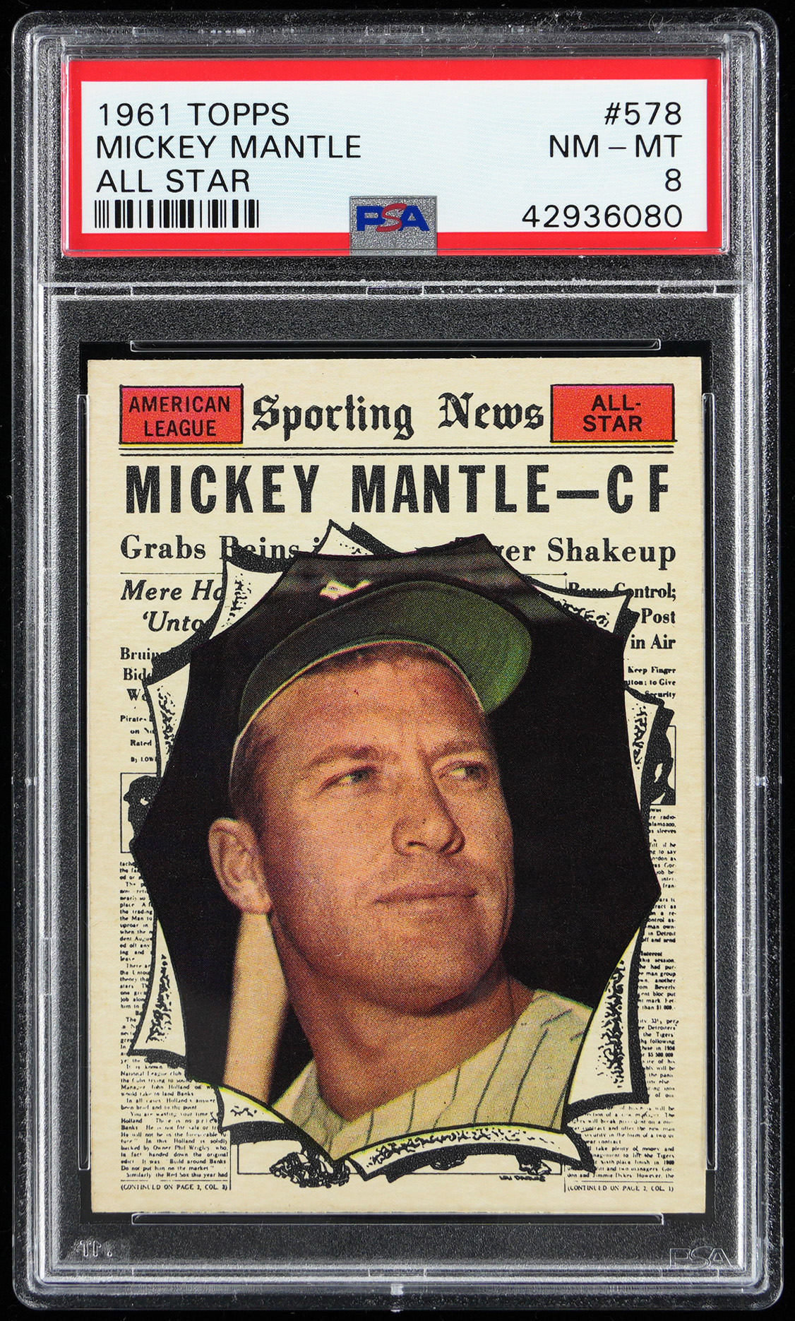 Graded NM-MT 8 by PSA. Headlining 1961 Topps #578 Mickey Mantle All-Star. This difficult high number recognizes the switch-hitting slugger as a Sporting News All-Star with his portrait bursting through a newspaper design. Ranks in the upper 16% of all similar copies validated by the authenticator.