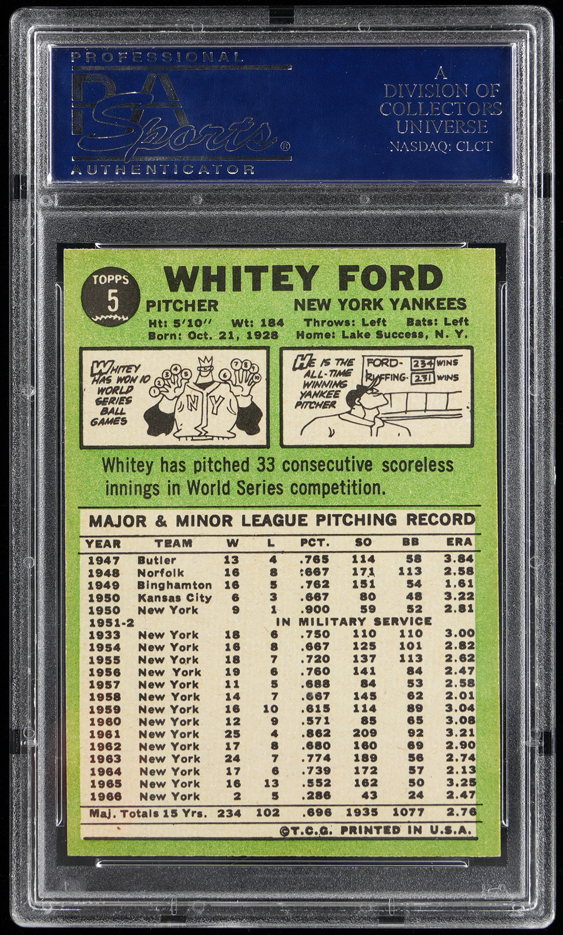Graded MINT 9 by PSA. The New York Yankees Hall of Fame southpaw is pictured on a gum card for the final time on the offered 1967 Topps #5 single. A near perfect specimen with attributes as pinpoint as one of Ford's perfectly placed pitches. Ranks in the upper 3.2% of all similar copies judged by the authenticator.