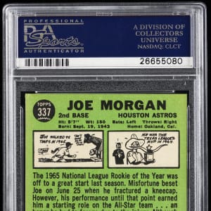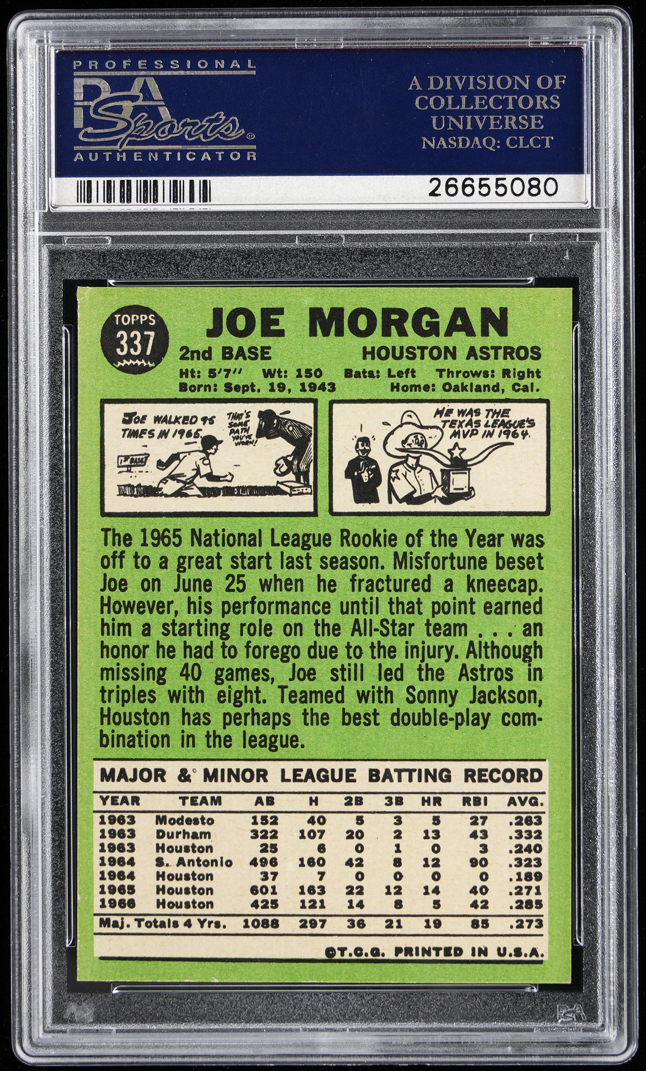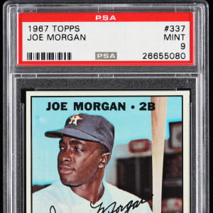 Only 5 Better! Graded MINT 9 by PSA. A young Joe Morgan chokes up on this 1967 Topps #337 gum card. The multi-talented Houston Astros Hall of Famer exhibits four razor-sharp corners, radiant edges, and eye-catching surface colors. Ranks in the upper 8% of all similar copies evaluated by the grading service.