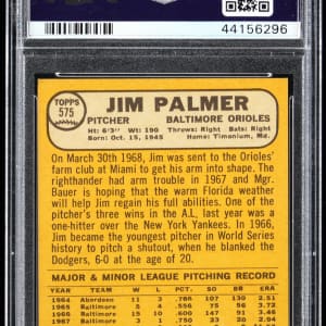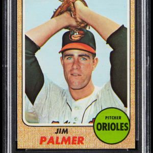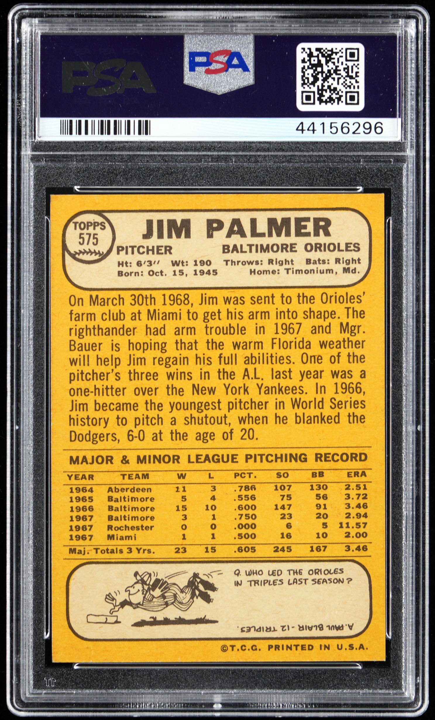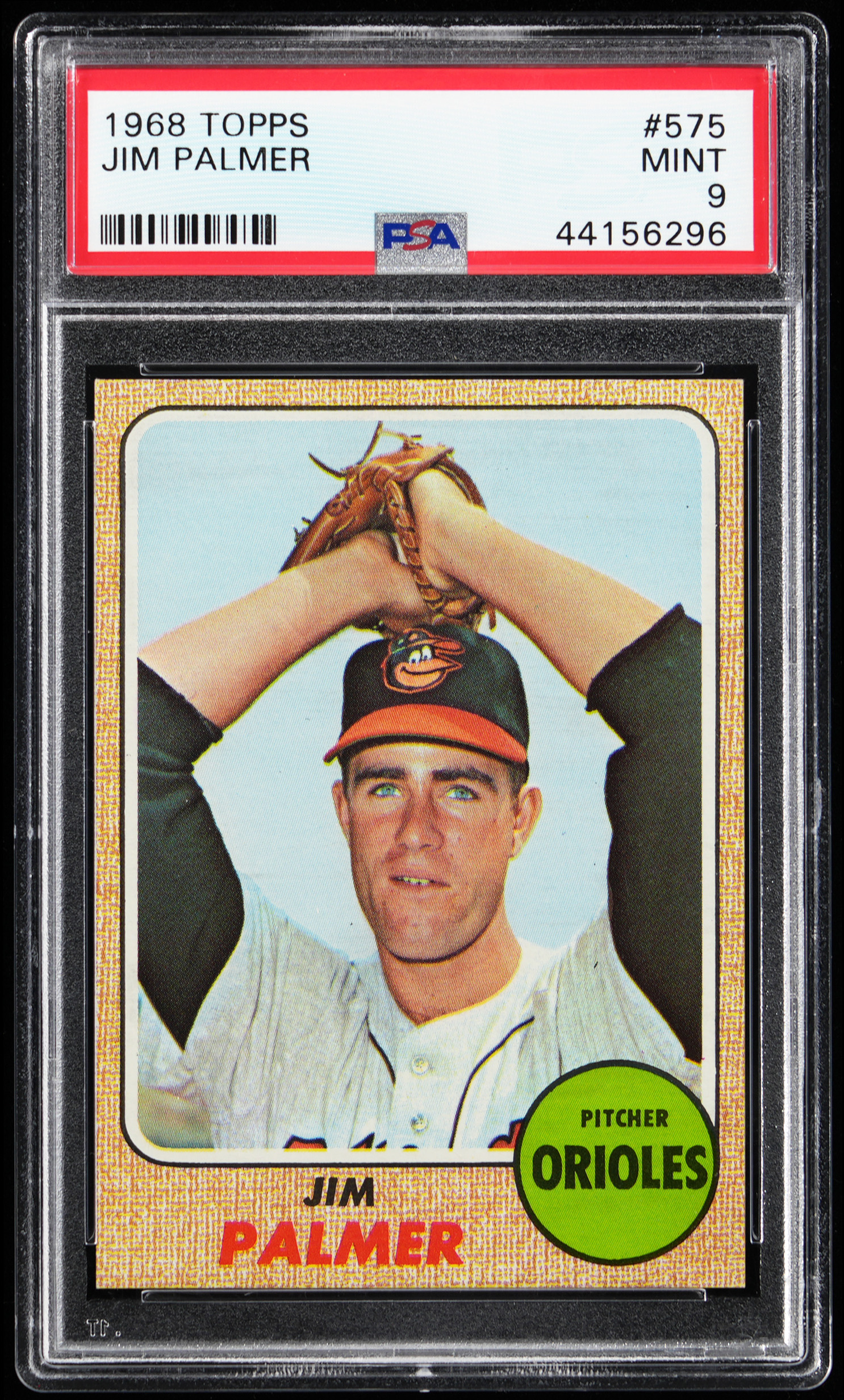 Graded MINT 9 by PSA. Fun fact: The Baltimore Orioles have never been to the World Series without Hall of Famer Jim Palmer on their roster. The Birds ace emerges victorious again on the offered 1968 Topps #575 high number. Ranks in the upper 8% of all similar copies judged by the grading service.