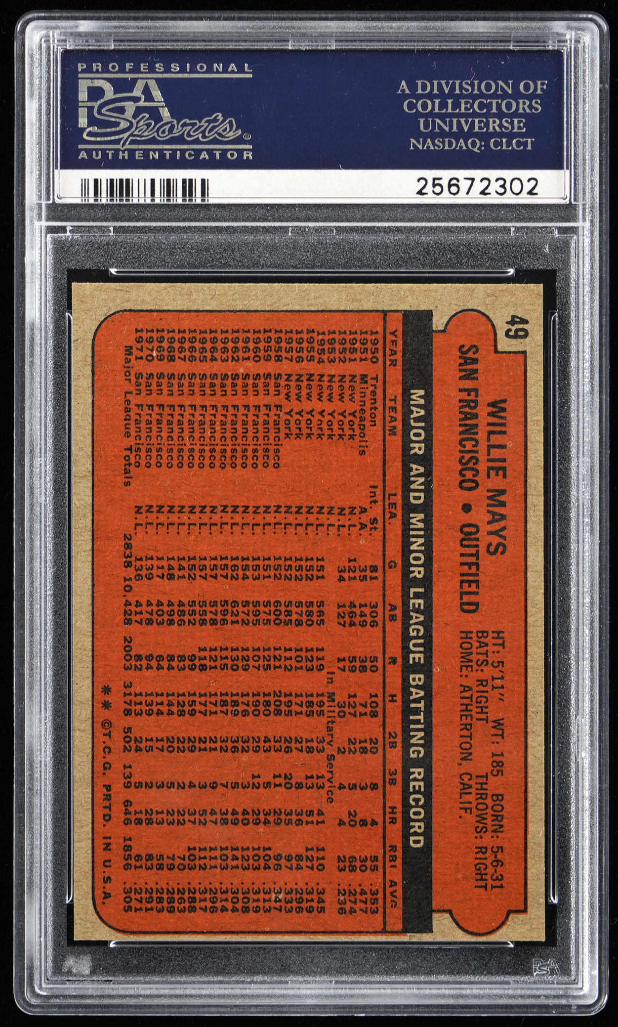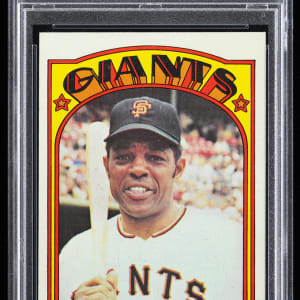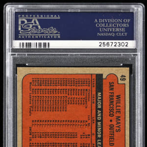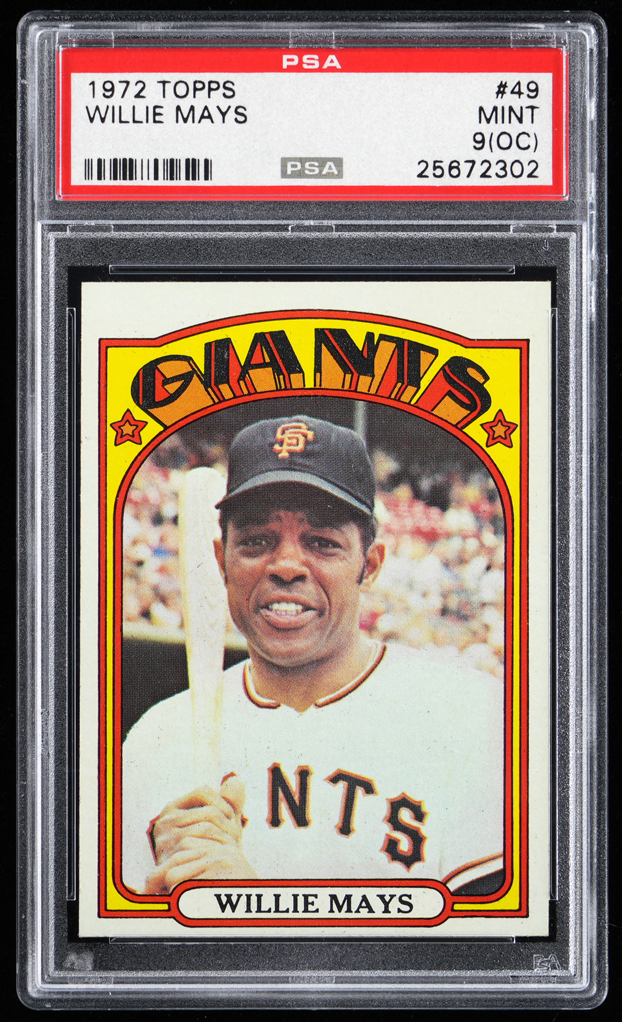 Graded MINT 9 by PSA with an (oc) qualifier. The final Topps flagship card picturing the legendary Willie Mays as a member of the New York/San Francisco Giants franchise. With exception to factory errant centering, this "Say Hey" is sparkling clean!