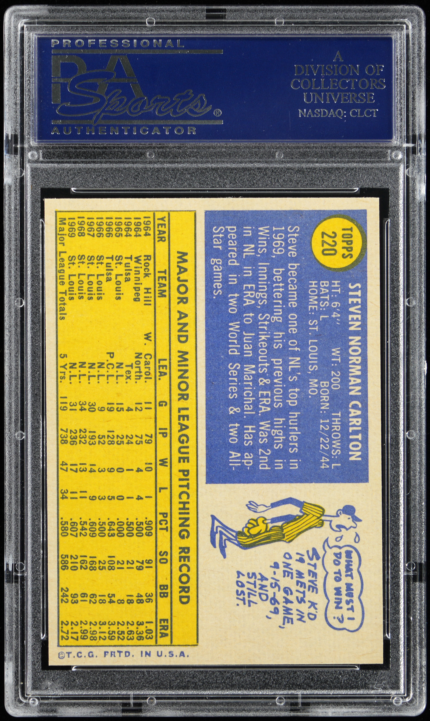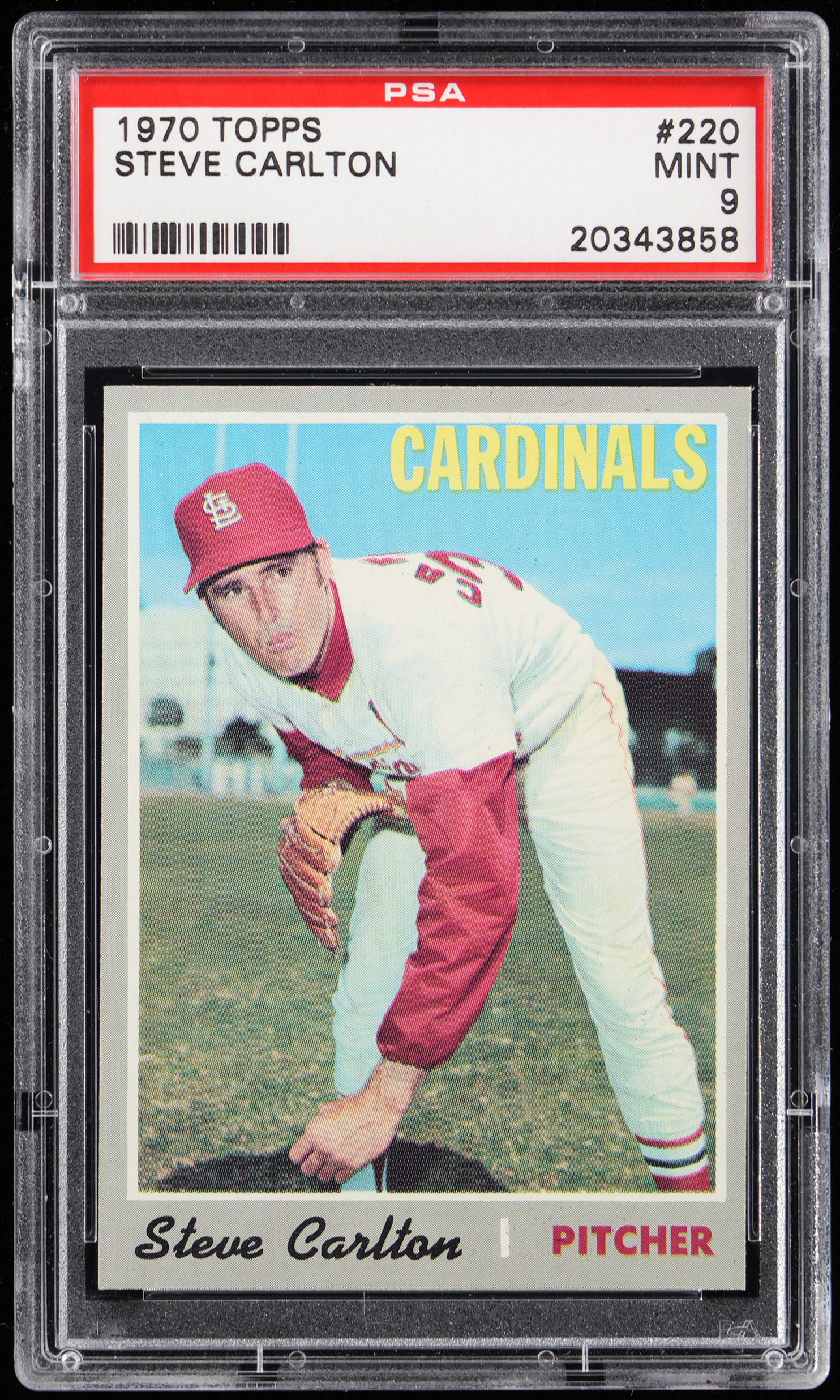 Graded MINT 9 by PSA. Splendid 1970 Topps #220 single of St. Louis Cardinals Hall of Fame pitcher Steve Carlton. Ranks in the upper 7% of all similar copies evaluated by the grading company.