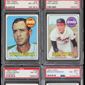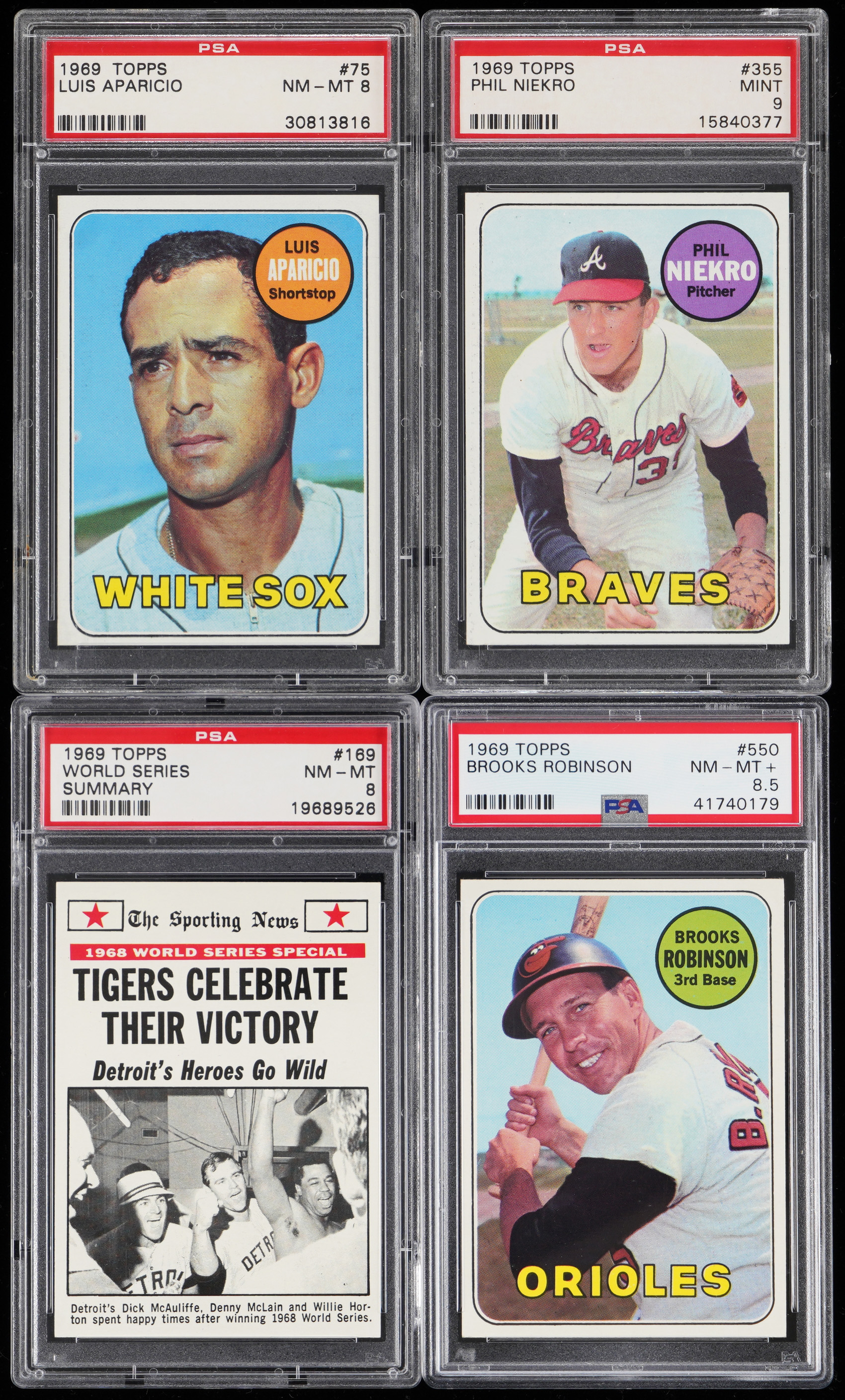 Each graded from NM-MT 8 to MINT 9 by PSA. A keynote quartet of 1969 Topps Hall of Fame and star high-grade singles. Includes: PSA MINT 9: #355 Niekro; PSA NM-MT+ 8.5: #550 B. Robinson; PSA NM-MT 8: (2 cards) with #75 Aparicio and #169 World Series Summary.