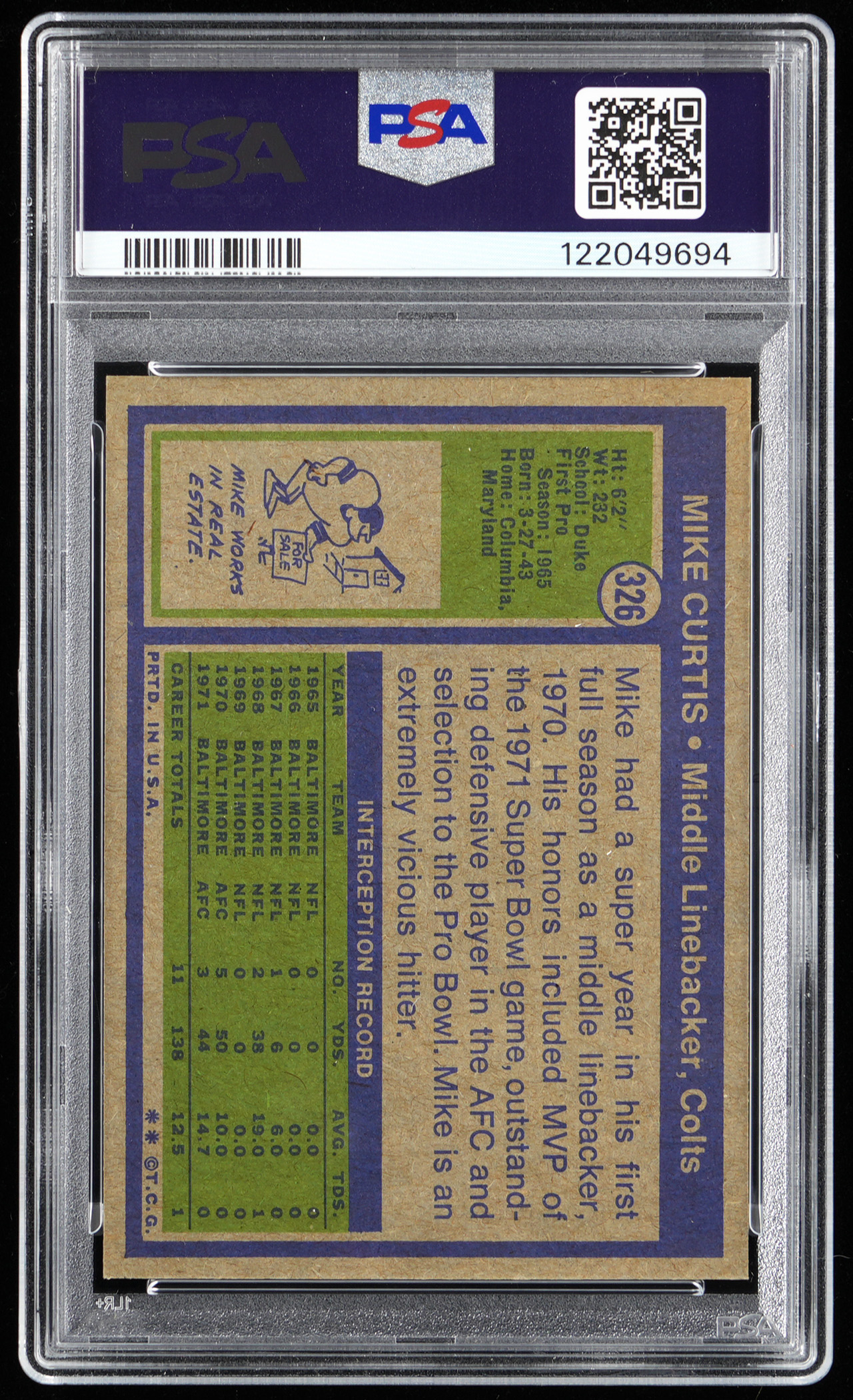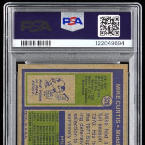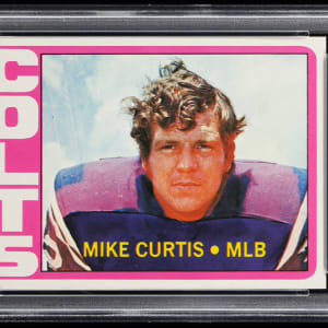 Population 9! Graded GEM MINT 10 by PSA. Baltimore Colts linebacker (who once laid out a streaker) Mike Curtis. Tough high number.