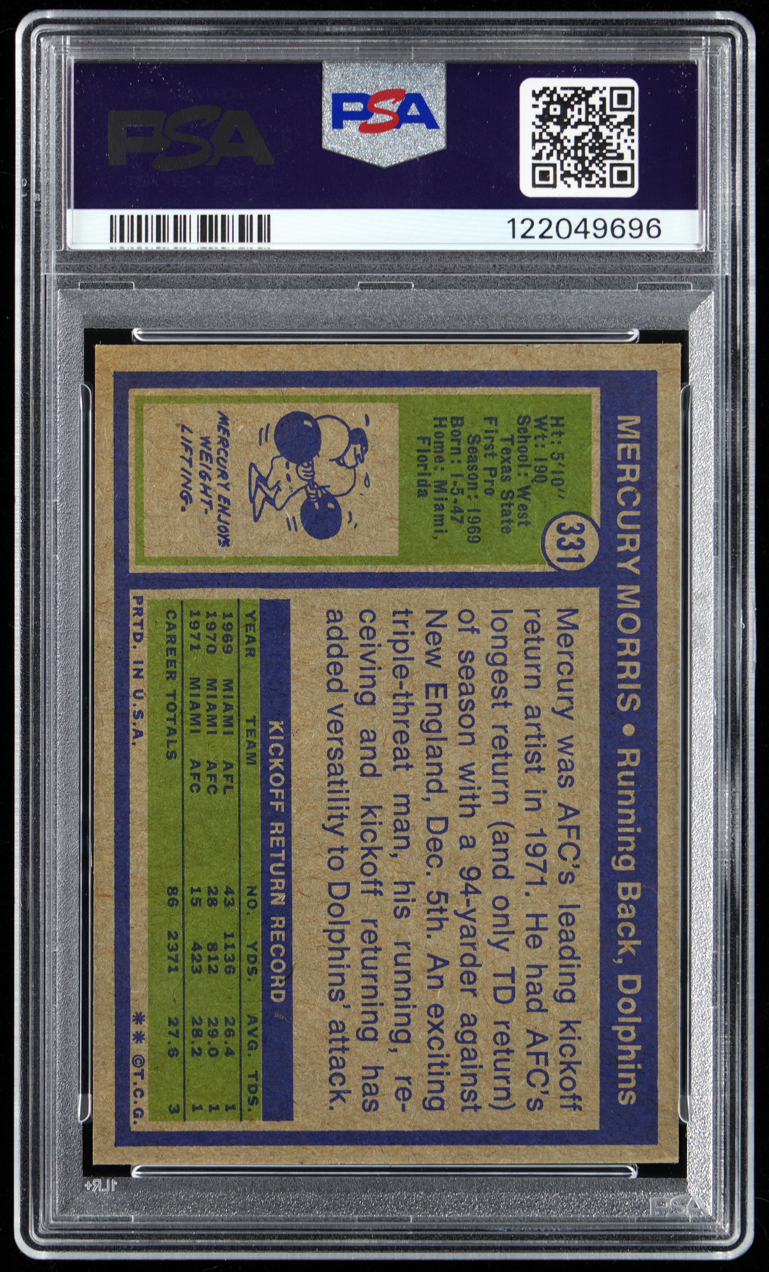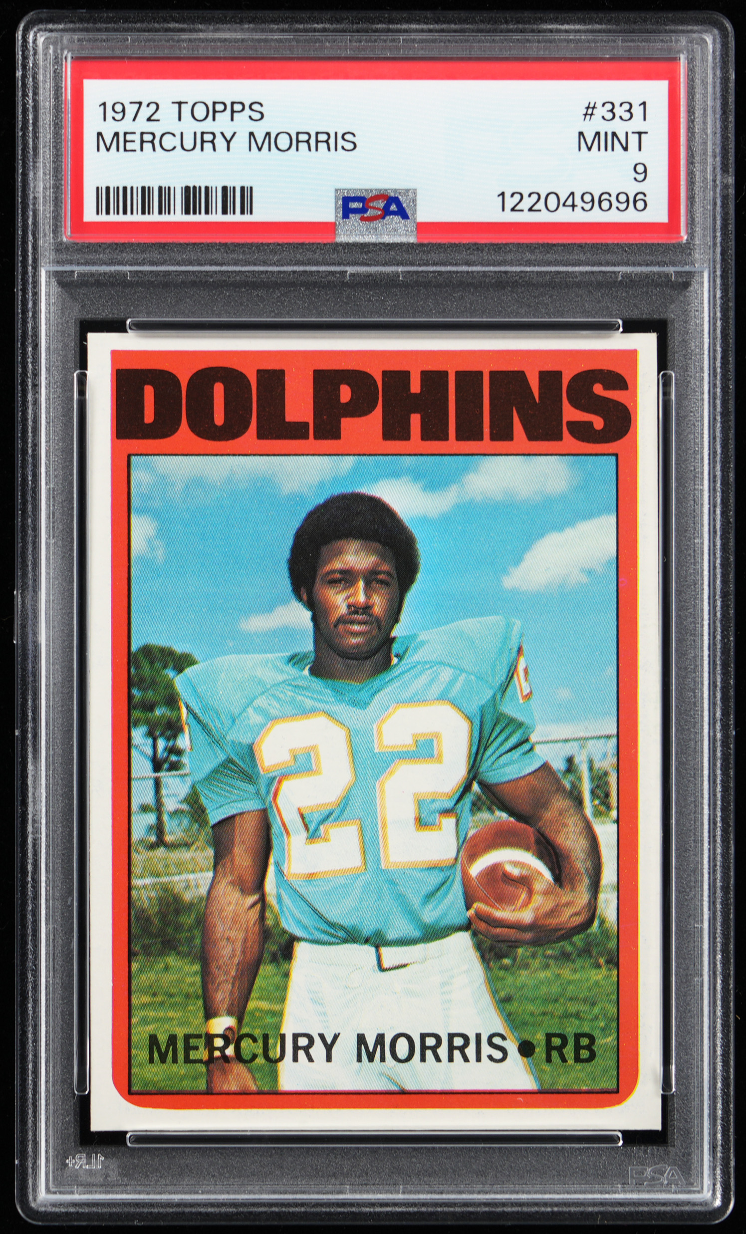 Graded MINT 9 by PSA. Turn up the bidding heat on the offered 1972 Topps Football #331 Mercury Morris high number. This flashy Miami Dolphins running back who always reminded fans of the franchise's perfect 17-0 season ranks in the upper 1.6% of all similar copies judged by the grading service.
