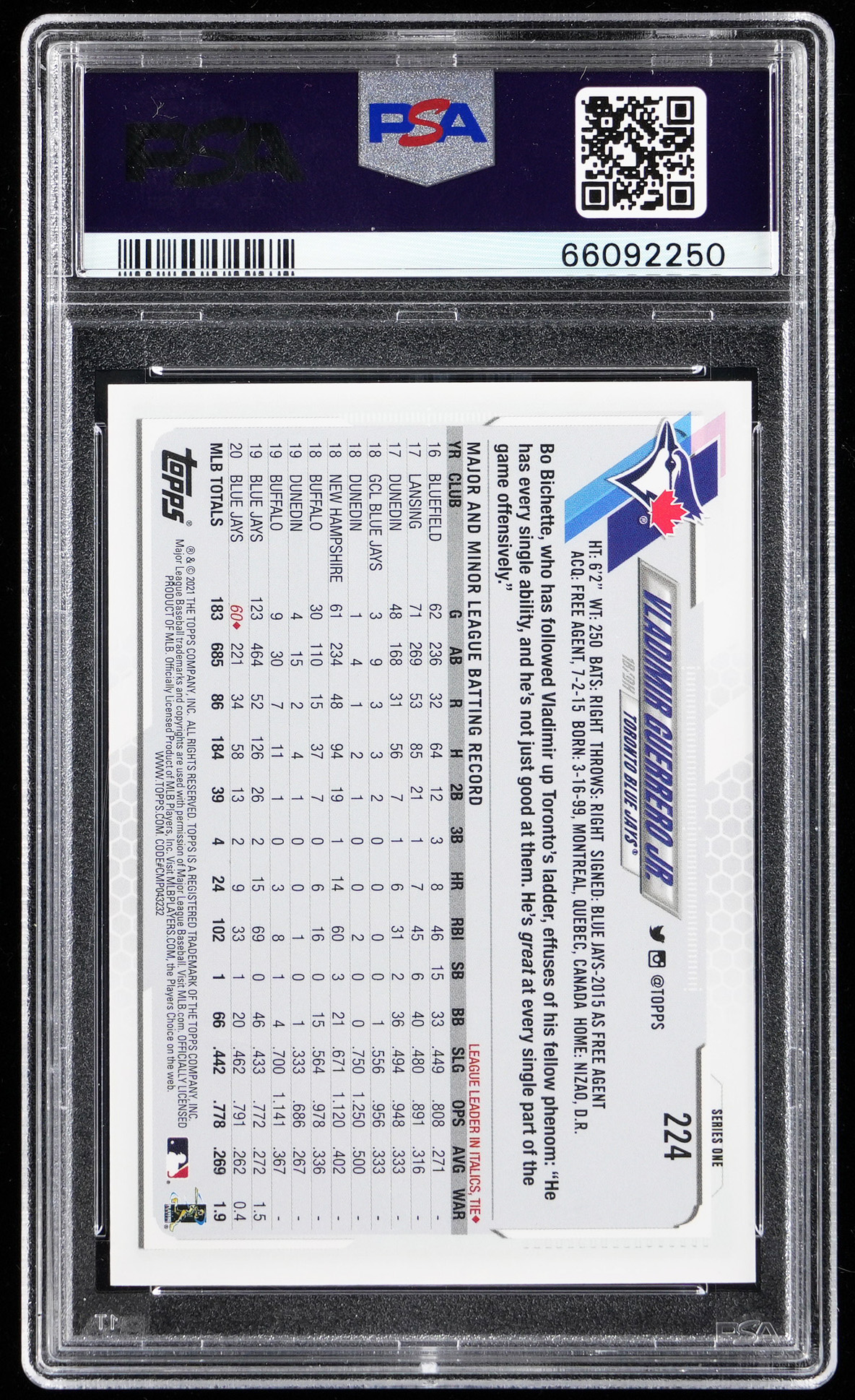 Graded MINT 9 by PSA. Over his seven-season career, Toronto Blue Jays superstar Vladimir Guerrero Jr. has played in five All-Star games with several probable elections in the future. "El K" is portrayed participating in All-Star festivities with the offered 2021 Topps #224 ultra short print. Only 11 total copies of this rarity have been judged by the grading company.