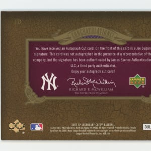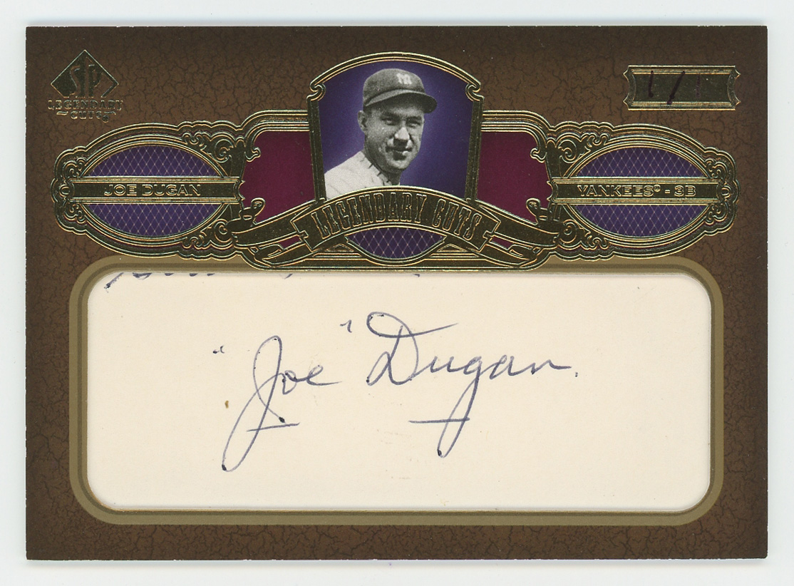 Serially numbered #1/1. The only 2007 SP Legendary Cuts autograph produced for New York Yankees star "Jumping" Joe Dugan. This modern insert is hand-numbered on the upper right corner and presents in overall (NM to Mint) condition.