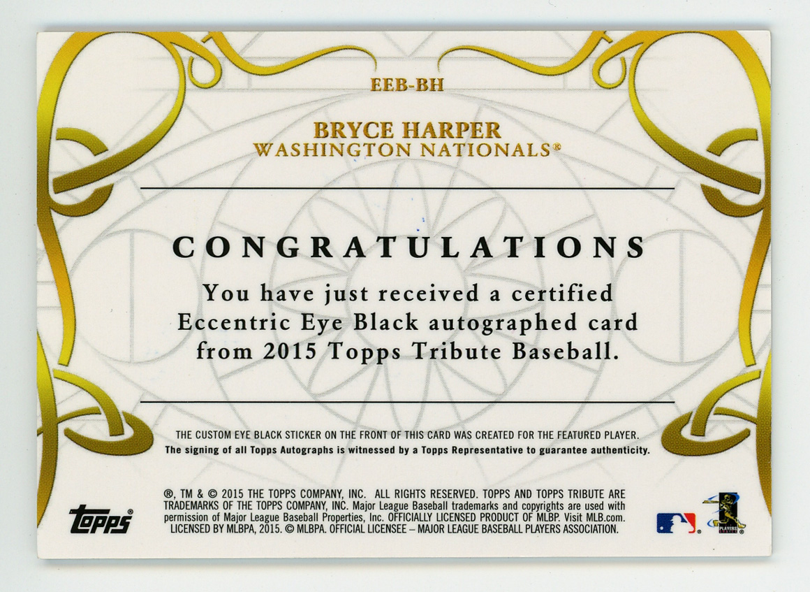 Serially numbered #1/5. Washington Nationals star Bryce Harper represents "702" (the area code for his hometown Las Vegas, Nevada) on the offered 2015 Topps Tribute Eccentric Eye Black certified autograph card. The sweet blue Sharpie stroke of the future Hall of Famer is flawless and the overall presentation of this modern insert is high-grade.
