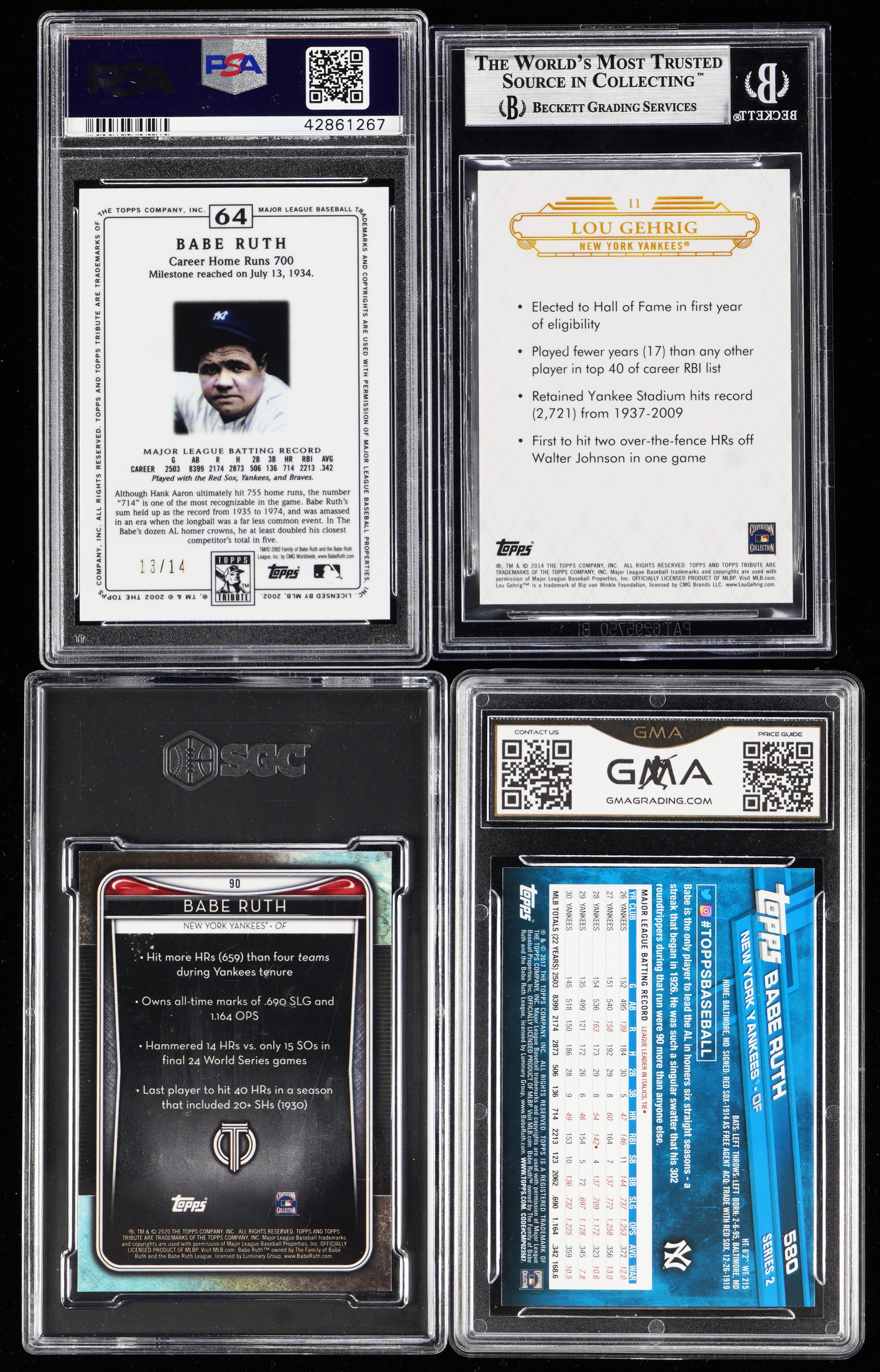 The heart of Murderers' Row reaches the seats with this grand slam of 2002-2020 Babe Ruth and Lou Gehrig numbered and shortprint graded inserts. Includes: Babe Ruth: (3 cards) with 2002 Topps Tribute #64 First Impressions #/14 (PSA MINT 9), 2017 Topps #580 SP (GMA GEM MINT 10), 2020 Topps Tribute #90 Black #1/1 (SGC NM/MT+ 8.5) and Lou Gehrig: (1 card) with 2004 Topps Tribute #11 Red #/5 (BGS MINT 9).