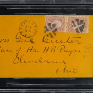 Ride to the sound of the guns, for this 1860s General George A. Custer signed envelope. Born in 1839, Custer met an untimely demise at the age of thirty-six, during the famous 1876 Battle of the Little Big Horn. A fearless and skilled cavalryman, Custer was appointed Brigadier General of the Michigan Volunteers on June 29, 1863, at the height of the Civil War. On March 13, 1865, he was made a Brevet Major General of the Regular Army. Custer's writing on the front of the offered envelope reads in full as "Mrs Genl Custer, Care of Hon HB Payne, Cleveland Ohio". Henry B. Payne was an Ohio statesman, who later served in both the U.S. Senate, and House of Representatives. The envelope is affixed with two 3-cent postage stamps at top-right. Both stamps are canceled with heavy marks, and a Washington D.C. postmark at top-center is dated Sep 03.