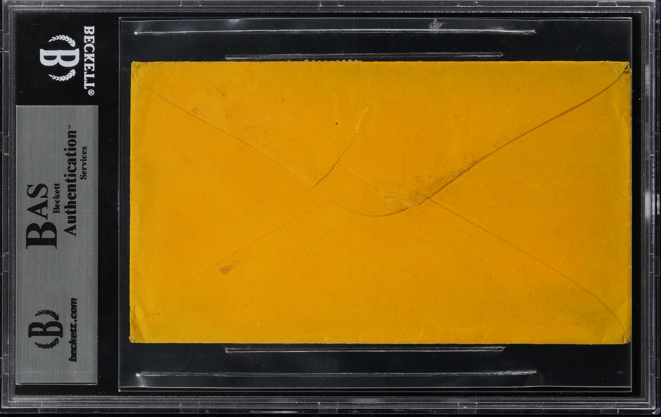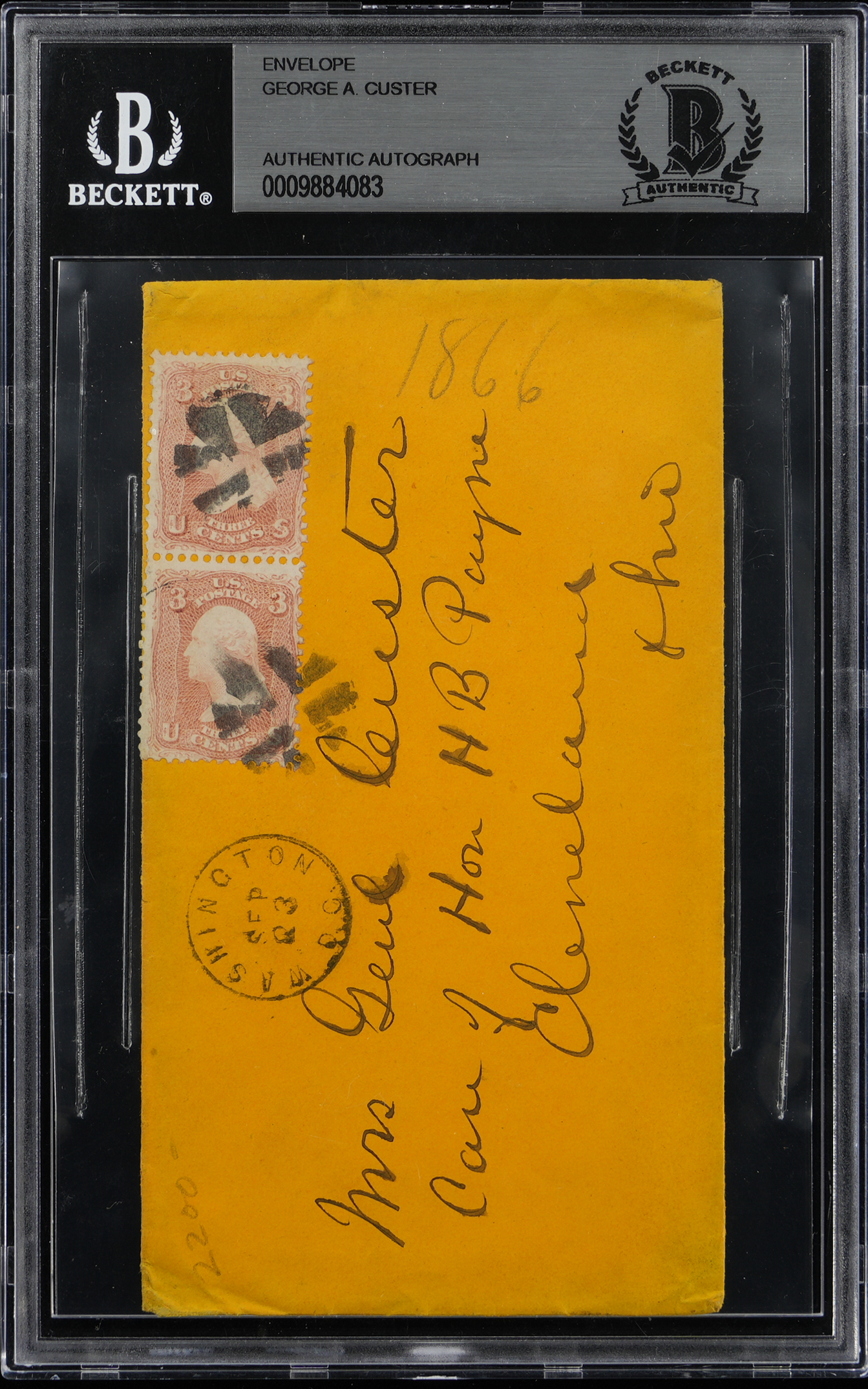 Custer married his beloved wife Elizabeth "Libbie" Bacon, on the 9th of February in 1864. It is well-known that Custer sent Libbie passionate love letters on a frequent basis, and it's a sure bet this envelope delivered a piece of his arduous correspondence. In the Summer of 1866, Custer's rank became Lieutenant Colonel, dating this envelope to a window of 1864-1866. Though Custer's writing is one hundred and sixty years old, it remains distinct, and readily recognizable. With strategic matting, the "Genl Custer" portion of the address could readily be showcased as a pleasing example of Custer's greatly prized, and considerably tough signature. BAS has encapsulated this antique treasure with an Authentic Autograph designation.