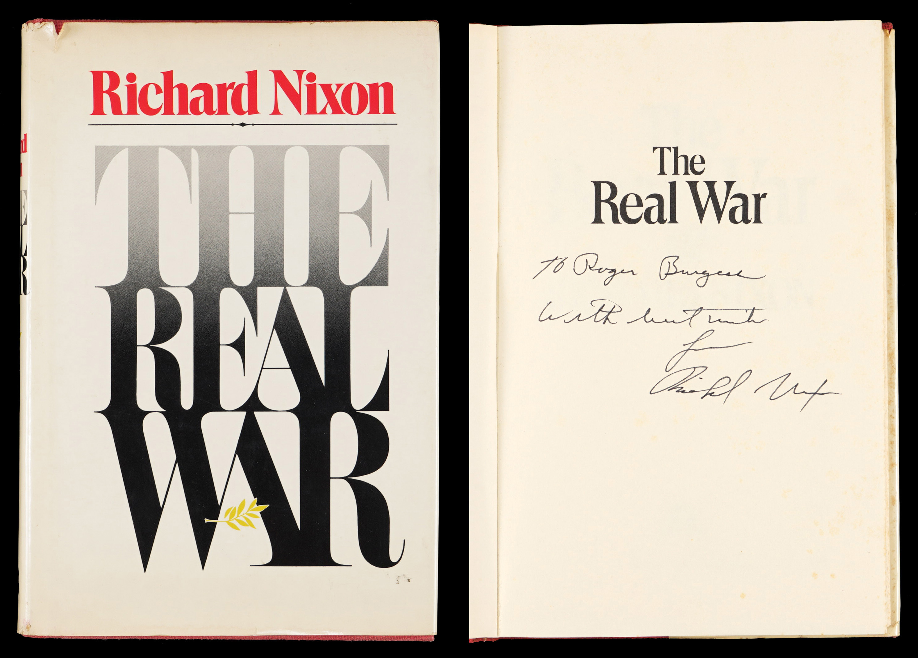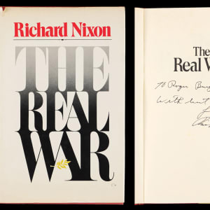 Assuming the role of author, Richard Nixon provides his contemporary period views on the Soviet Bloc, the Cold War, Presidential power, and more, with this signed 1980 hardcover book "The Real War". An elder statesman at the time, the well-traveled 37th President had first hand knowledge, and keen insights into what it takes to be the leader of the free world, while balancing relations with foreign powers bent on dubious agendas. This vintage book reports in solid condition, with moderate wear on the dust jacket. Nixon has signed and personalized the title page, and his signature is potent application.