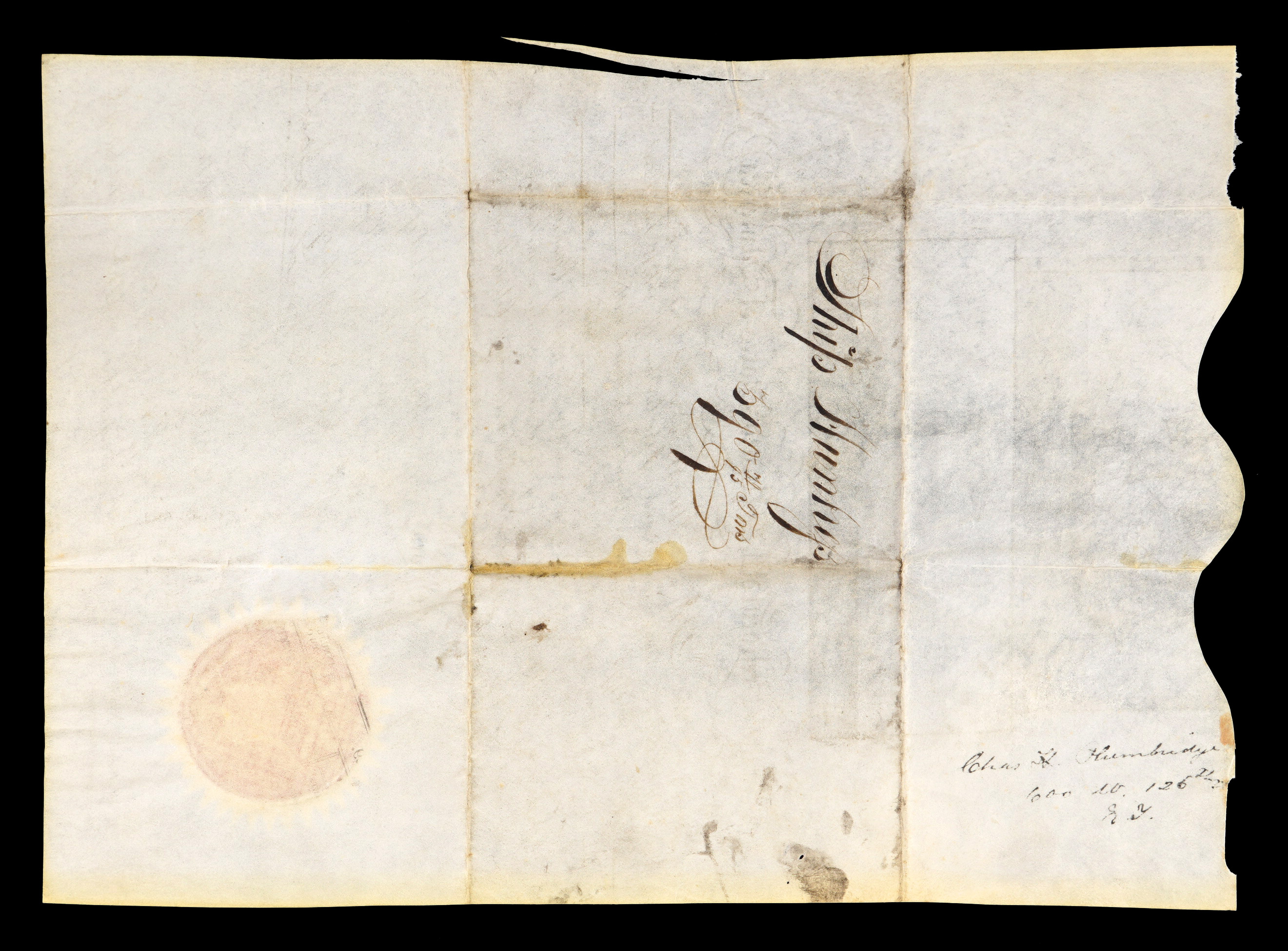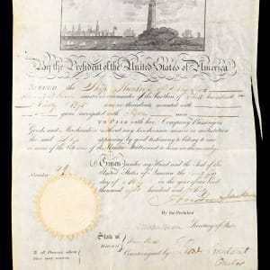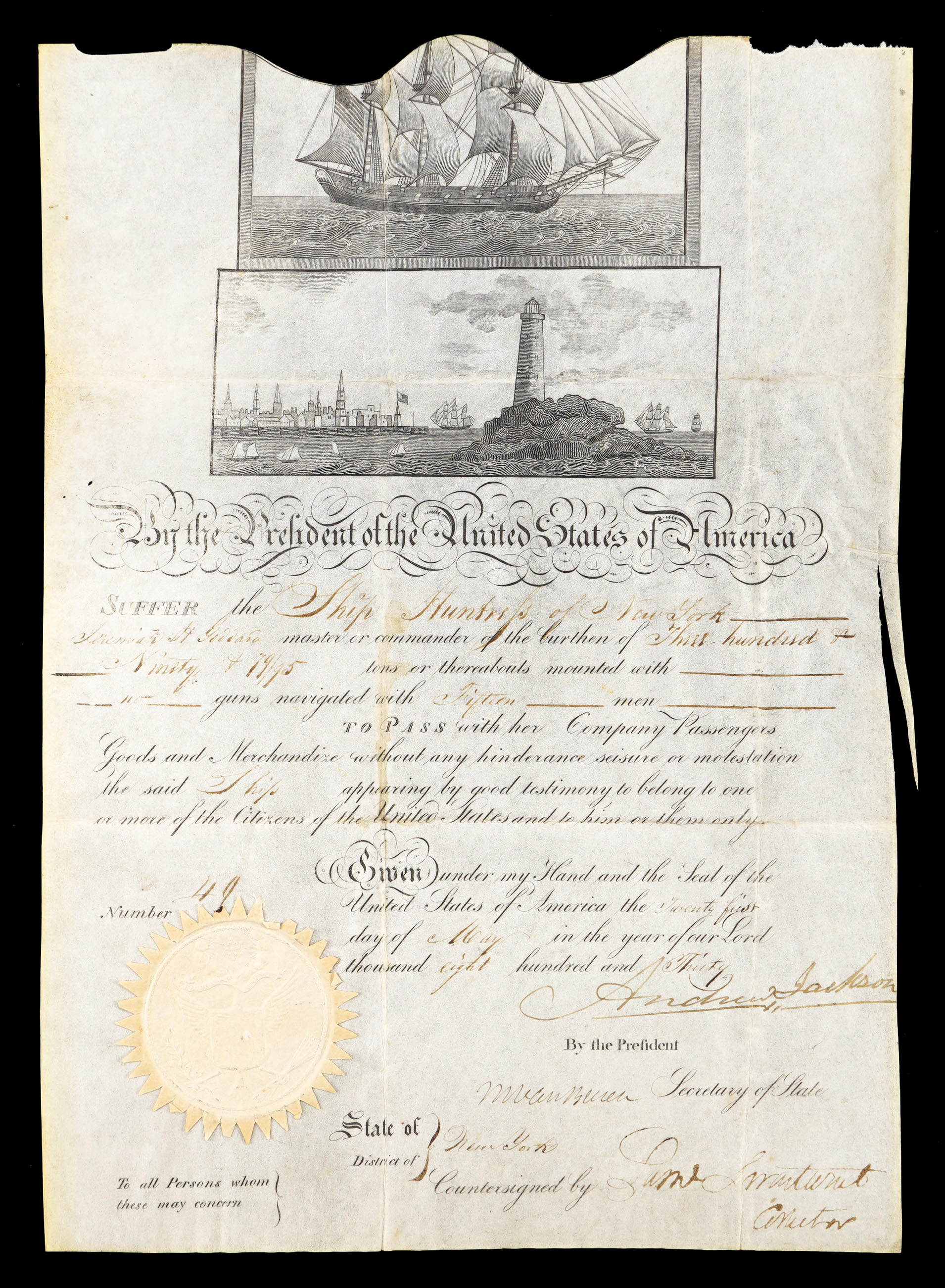 Bag two presidents at once, with this 1830 nautical right of passage document dual-signed by Andrew Jackson, and Martin Van Buren. Sized at 10-1/2" x 15", this crisp, antique sailing document bears a raised seal at bottom-left. The majority of the text is printed and readily discernible, while the written entries are faded. As fortune would have it, the signatures of sitting President Jackson (d.1837), and Secretary of State Van Buren (d.1862) remain clearly recognizable. The part printed, part written date is legible, reading "the twenty first day of May in the year of our Lord thousand eight hundred and thirty". An undetermined countersignature is located at bottom-right, and the opposite side is addressed to Chas. H. Humbridge.