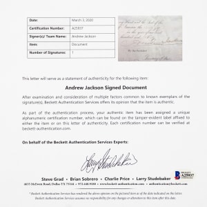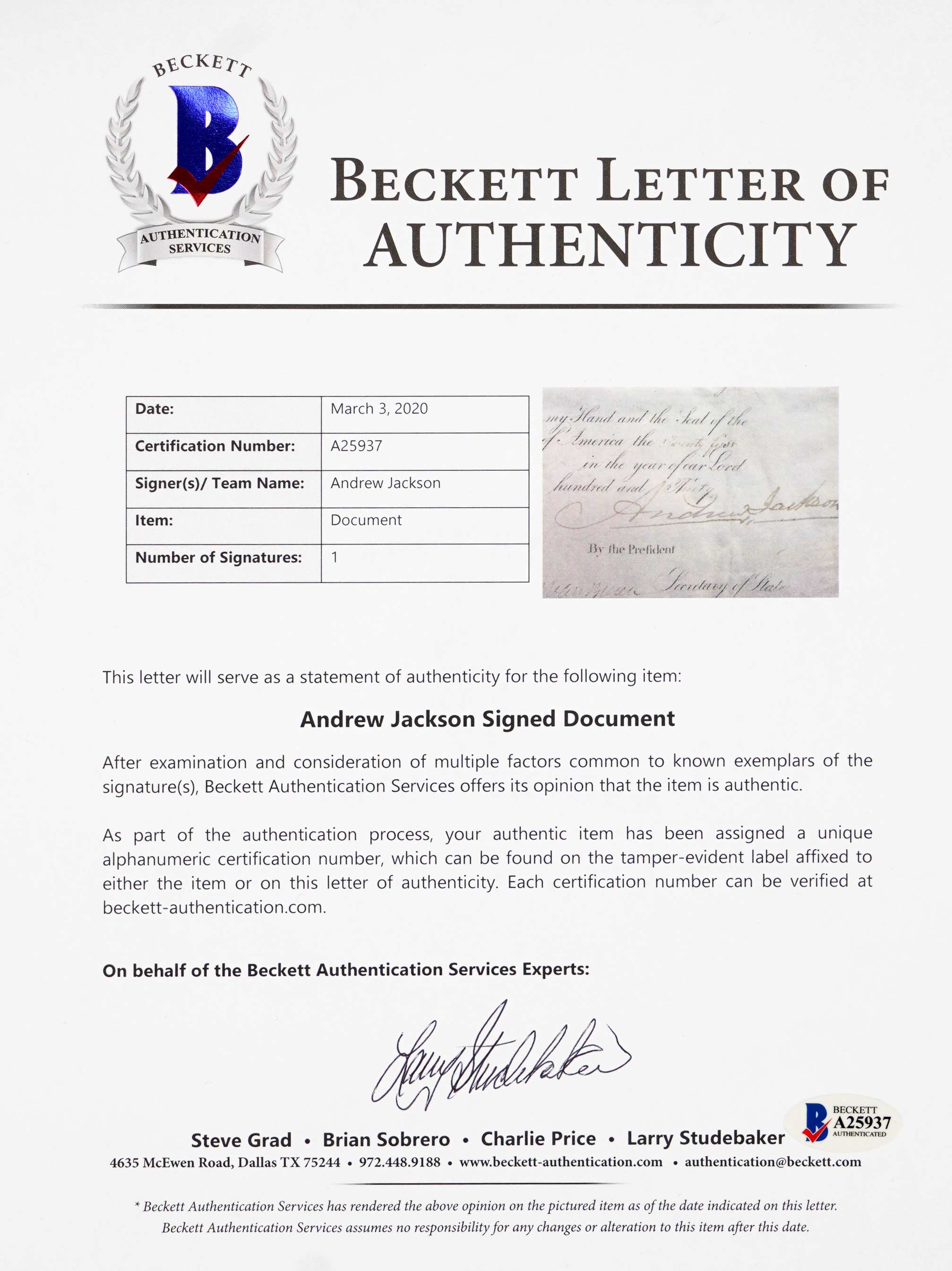 Full LOA from Steve Grad and Brian Sobrero/Beckett Authentication Services for Andrew Jackson.