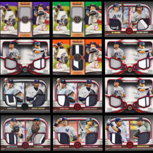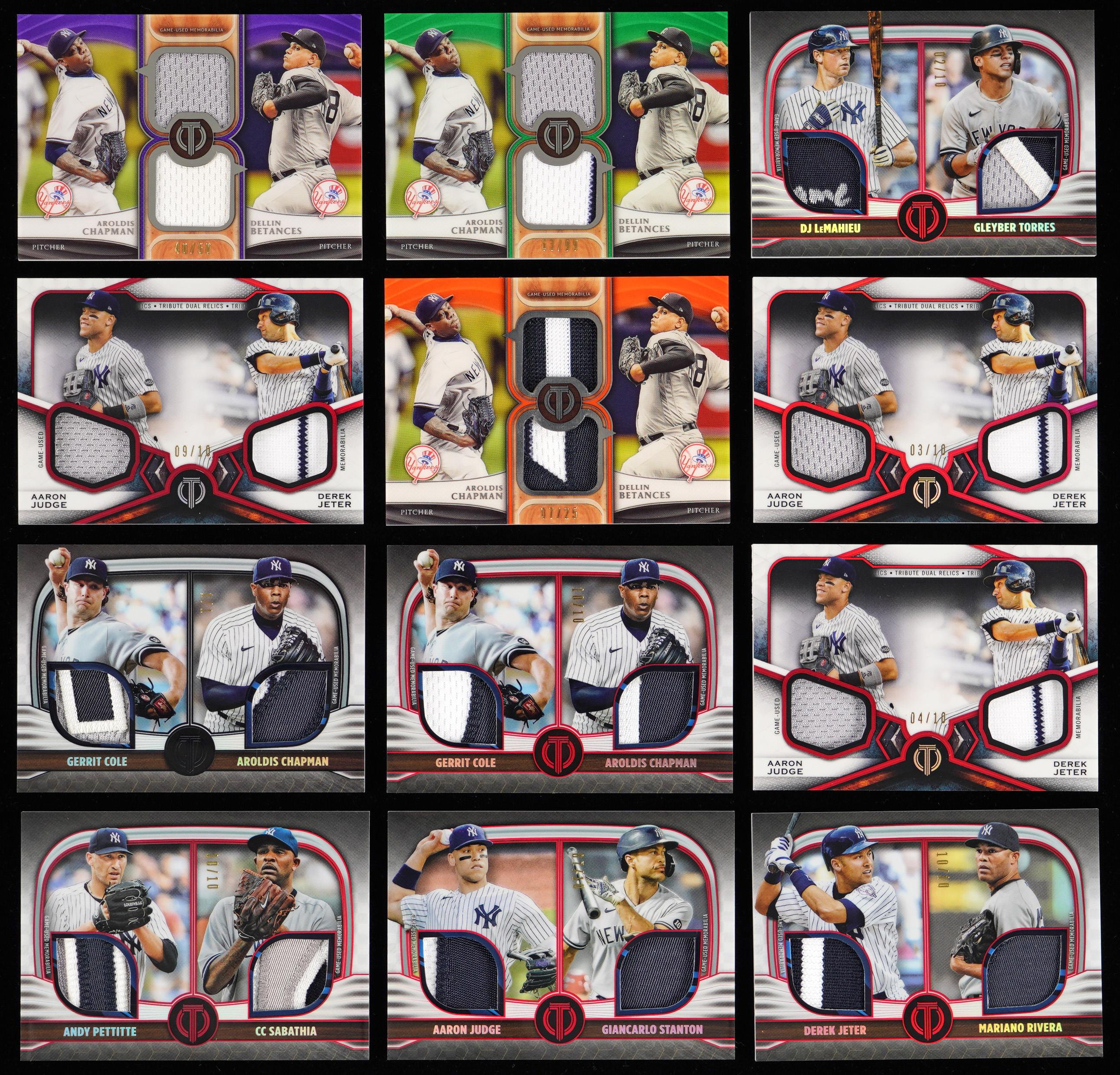 It's double trouble for opposing teams with these (22) 2018-2022 Topps Tribute New York Yankees dual relics featuring multiple near rainbows. Several multi-colored uniform swatches are present. Includes: 2018 Topps Tribute Dual Relics: (4) Betances/Chapman (#/25 orange, #/50 purple, #/99 green, #/150 base); 2019 Topps Tribute Dual Relics: (8) L. Severino/Tanaka ((4) #/10 red, #/25 orange, #/50 purple, #/99 green, #/150 base); 2020 Topps Tribute Dual Relics: Sabathia/Pettitte #/150 base; 2021 Topps Tribute Dual Relics: (3) Judge/Jeter (all #/10, red) and 2022 Topps Tribute Dual Relics: (6 cards) with (2) Cole/Chapman (#1/1 black, #/10 red), Jeter/M. Rivera (#/10, red), Judge/Stanton (#/10, red), LeMahieu/Torres (#/10, red) and Pettitte/Sabathia (#/10, red).
