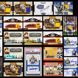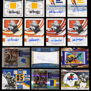 Auto/Jersey: (23 cards) with (2) 2001 Upper Deck Pros & Prospects A Piece of History Game Jersey, (3) 2006 Playoff National Treasures Canton Classics (one #/25, (2) #/85 with one two-color patch), 2007 Donruss Gridiron Gear Performers (#/20), (2) 2007 Leaf Limited Team Trademarks (one #/15 with two-color patch, one #/25), (3) 2007 Playoff National Treasures All-Decade (all #/10), (2) 2007 Playoff National Treasures Timeline (both #/10 with two-color patches), (4) 2009 Donruss Classics Singles (all #/25, one two-color patch), (2) 2009 Panini National Treasures Retired Numbers (one #/3 with two-color patch, one #/10), (2) 2010 Panini Certified #162 (both #/5 with two-color patches), (2) 2011 Playoff National Treasures #198 (both #/10);