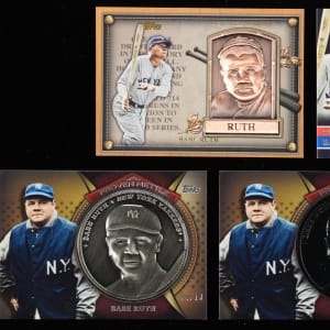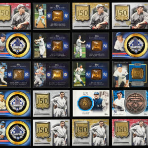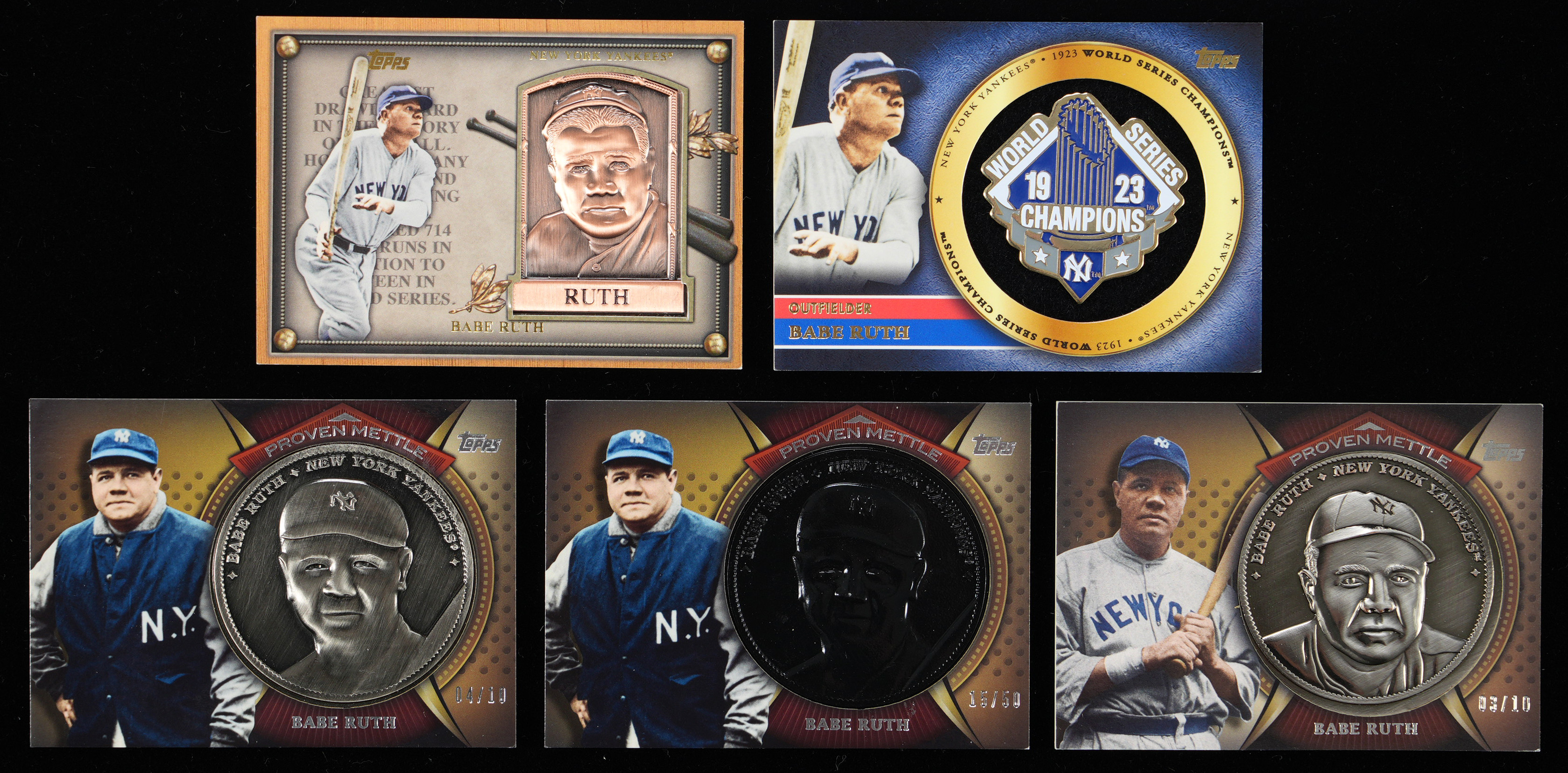 The New York Yankees add to their hardware collection with these (25) 2012-2019 Topps commemorative medallions and pins. Includes: 2012 Topps Commemorative Gold Pins: (5 cards) with DiMaggio, Gehrig, R. Jackson, Jeter, Ruth; 2012 Topps Commemorative Gold Hall of Fame Plaque Card: Ruth; 2012 Topps Commemorative Gold Player Ring: (6 cards, all #/736) with DiMaggio, Gehrig, Mantle, Maris, Mattingly, Ruth; 2012 Topps Commemorative Gold Team Ring: Mantle; 2013 Topps Pennant Chase: Ruth; 2013 Topps Proven Mettle Commemorative Coins: (3 cards) with (2) Ruth (#/10, #/50, with jacket), Ruth (#/10, matches jersey number, with bat); 2013 Topps Record Holder: Ruth; 2019 Topps 150th Anniversary Commemorative Medallions: (7 cards) with (3) Series 1 (#/25, #/50, #/150) and (4) Series 2 rainbow (#1/1, #/25, #/50, #/150).