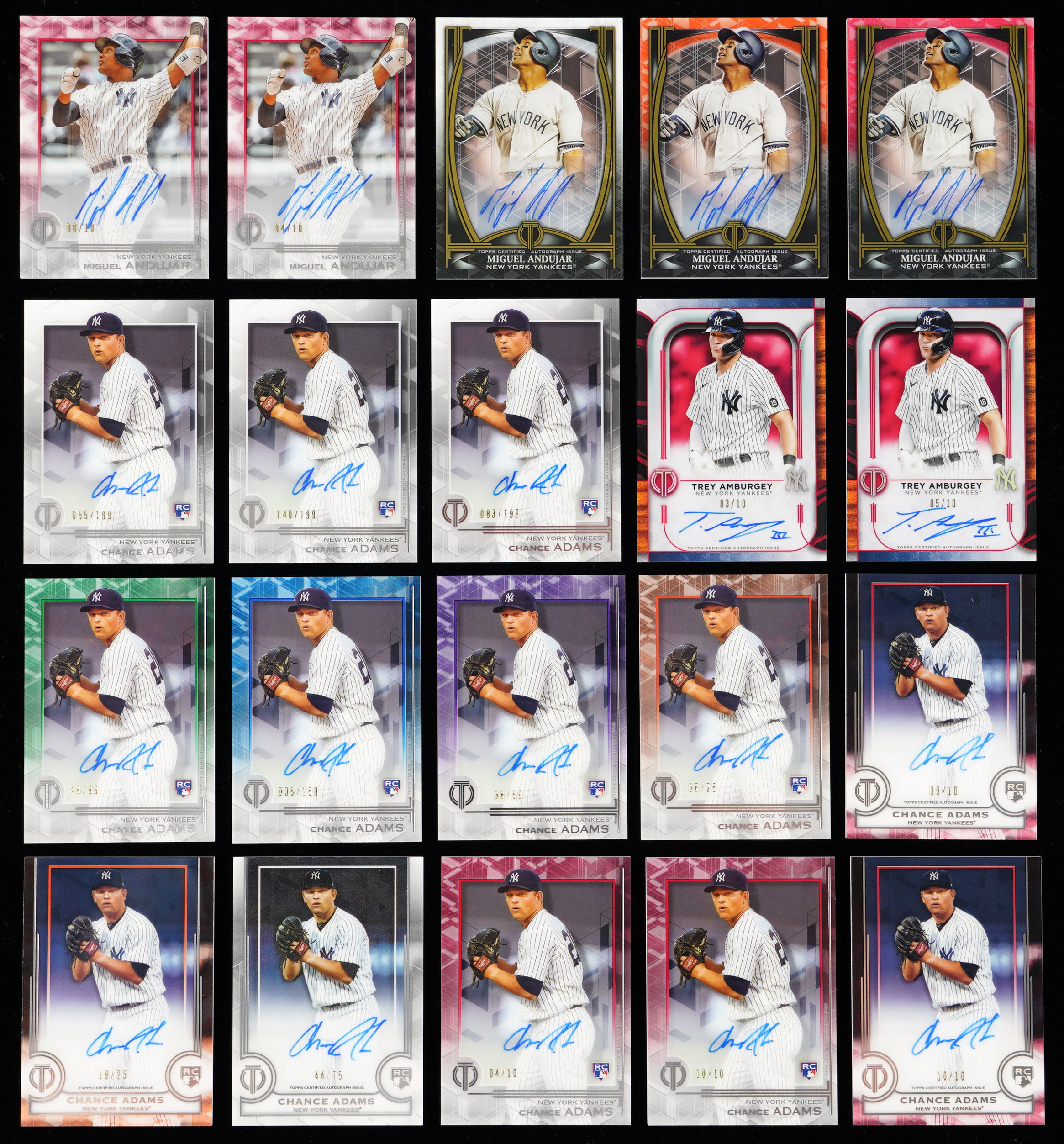 Extensive 2012-2022 Topps Tribute New York Yankees certified autograph collection of (166) cards with several near rainbows. These “on-card” signatures are each numbered with the majority falling in the #/5 to #/99 range. Mild duplication is uncovered throughout, and numerous color variations are present. Players quantities include: (13) C. Adams, (2) Amburgey, (11) M. Andujar, (17) Betances, (13) C. Frazier, (12) Gregorius, (9) Headley, (6) Montero, (20) Nova, (16) Nunez, (9) Pineda, (17) L. Severino, (11) J. Sheffield, Urshela and (9) Voit.