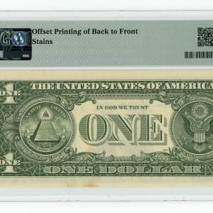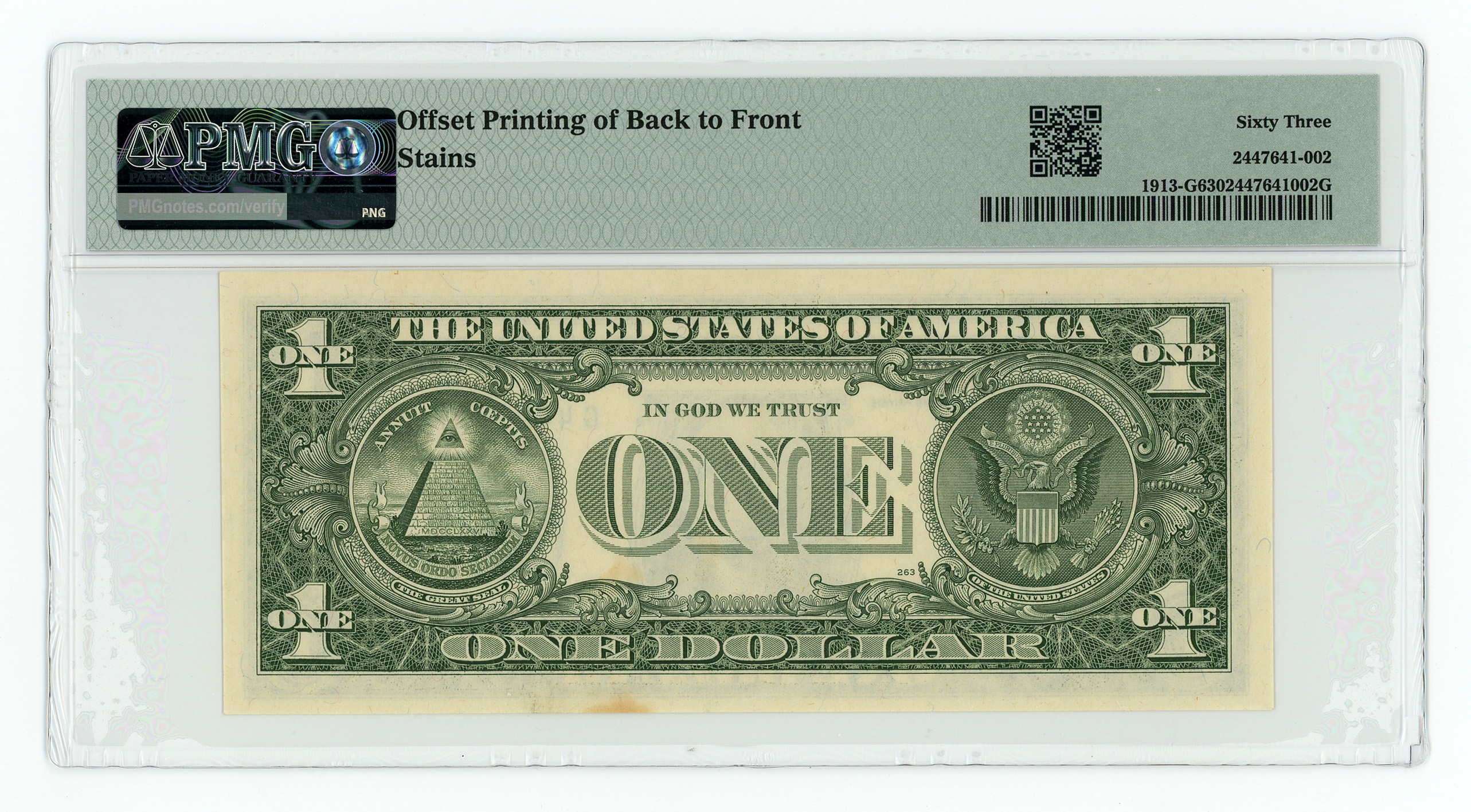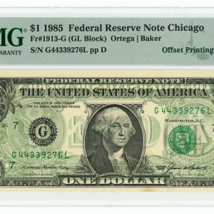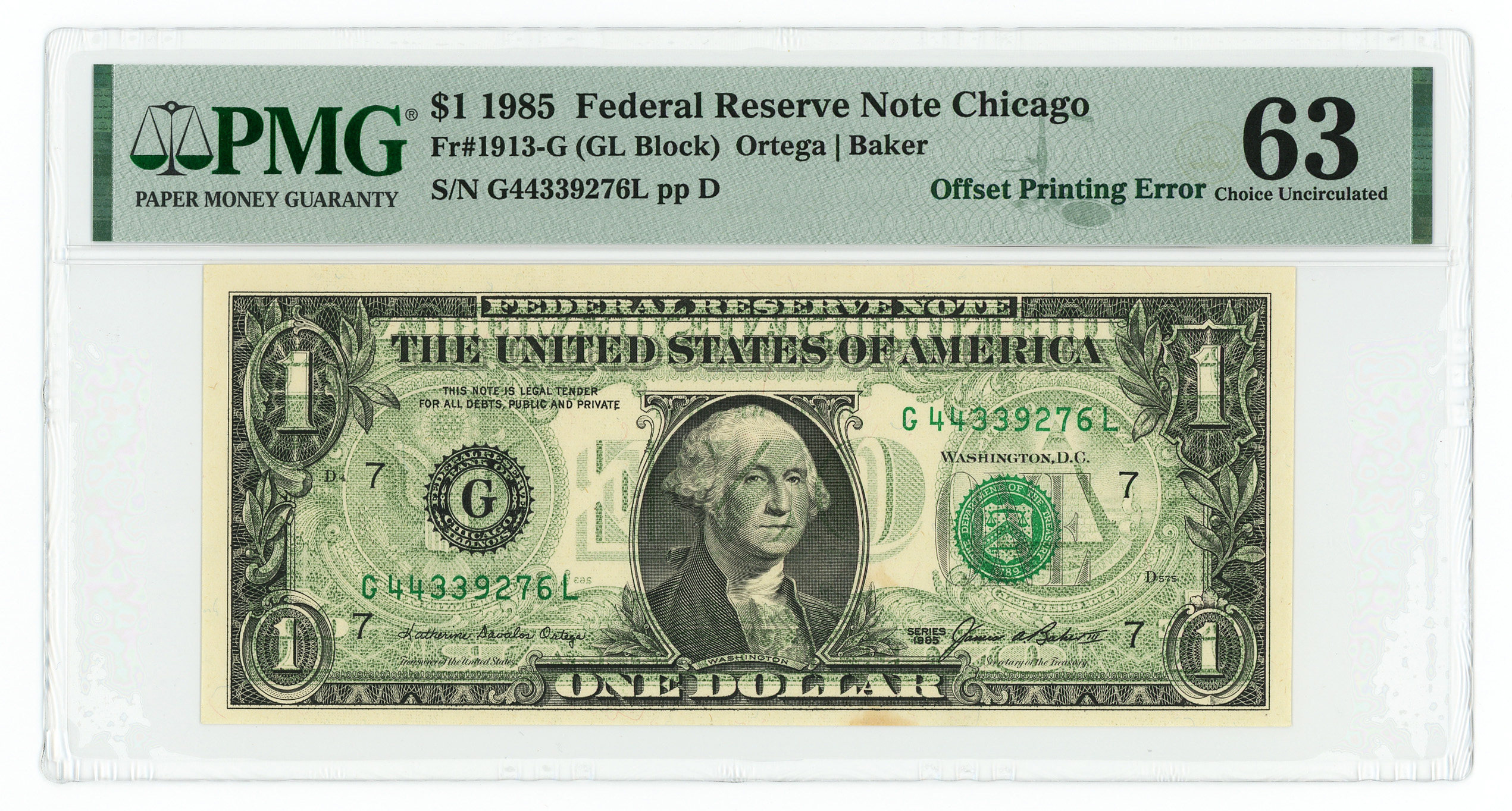 Currency collectors bank a high quality example, with this 1985 $1 Federal Reserve Note. This 20th Century greenback also has a green front, due to a back-to-front offset printing error. Serial numbered G44339276L, this one dollar bill is printed on the obverse with the same design seen on the reverse, including the legend "The United States Of America", which can be seen backwards across the top of this crisp note. PMG has just returned this very desirable error note, with a Choice Uncirculated 63 grade. While the offset printing is bold, the obverse details show through distinctly. Signatures are Ortega/Baker.