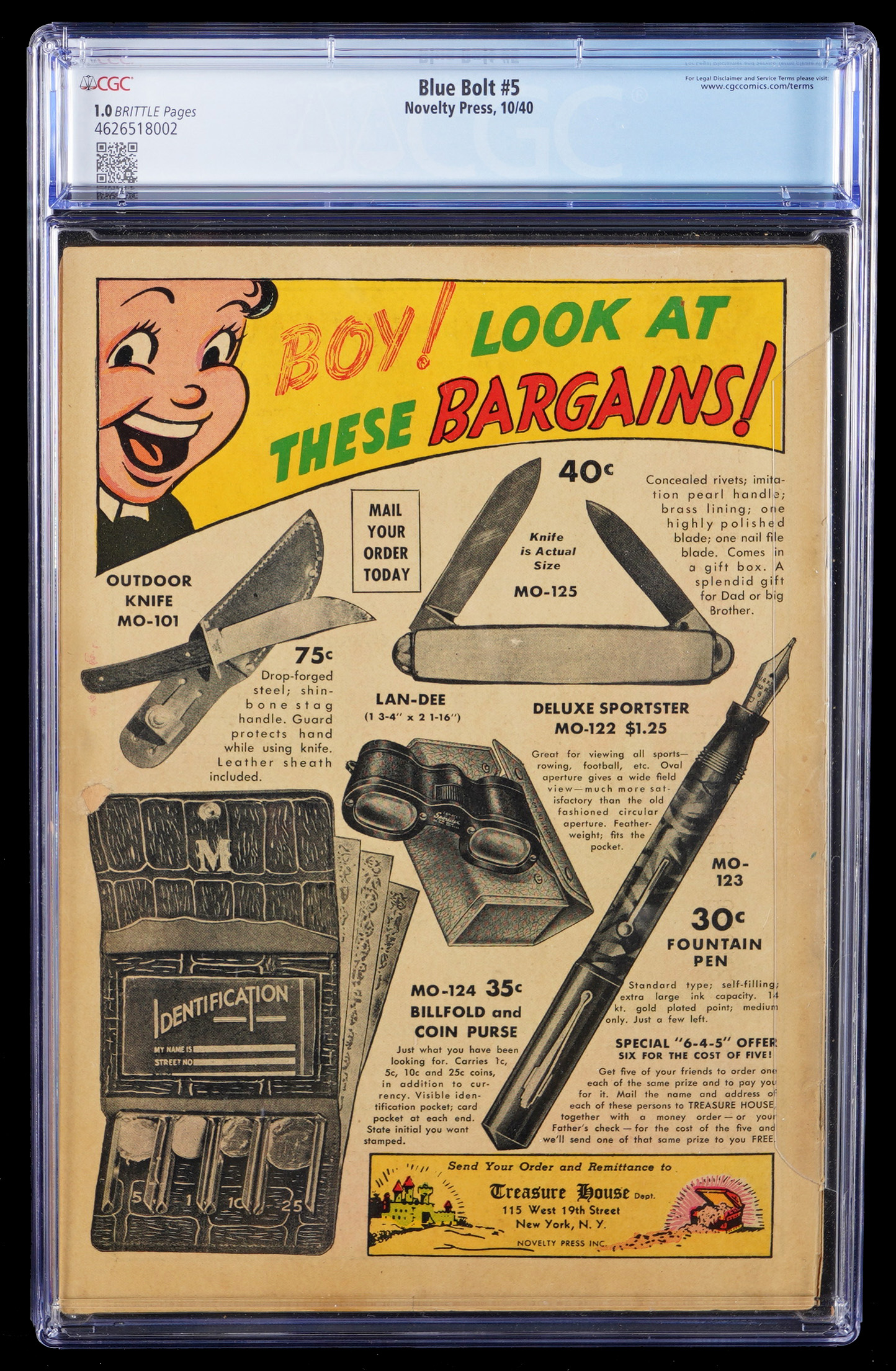 A scarce Golden Age comic book is presented, with this October, 1940 Novelty Press Blue Bolt #5 issue. Graced with writing and artwork by supreme comic beings Joe Simon and Jack Kirby, this issue predates their creation of Captain America by two months, making it one of the earliest works by the Simon and Kirby team. Fronted by a riveting cover, this early super-hero comic is quite scarce. Though CGC has encapsulated this book in a Universal Grade holder with a rating of 1.0, it still stands tall, as the best looking "1" we've ever seen. What really drives the value of this ancient issue, is the small surviving population. To date, CGC has graded just seven examples of this issue in Universal Grade holders, indicating it is a very tough find. Label notes are "Bill O'Connor story, W.E. Rowland cover, Bill Everett, Jack Kirby, Paul Gustavson, Joe Simon and Bob Davis stories and art.".
