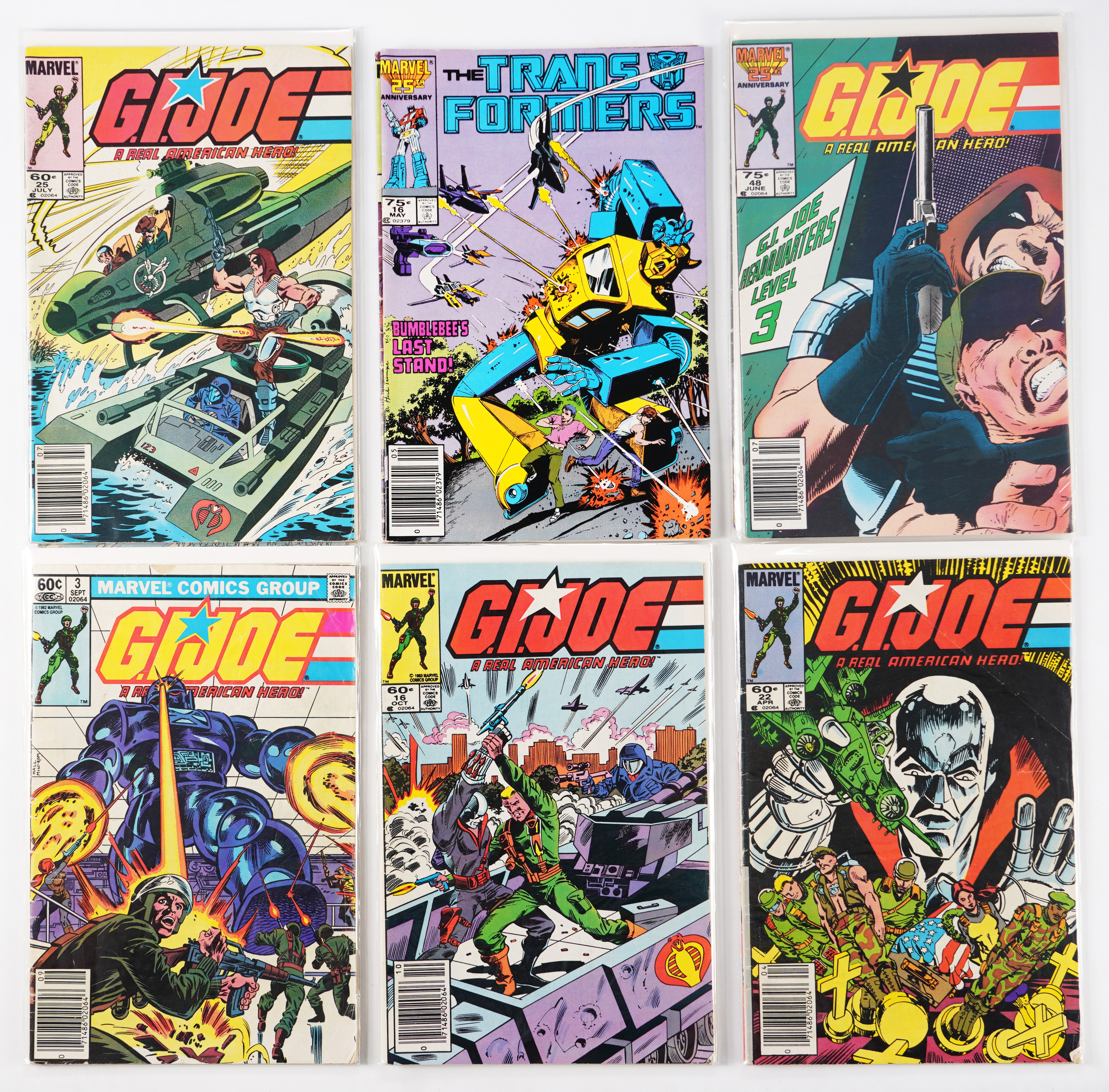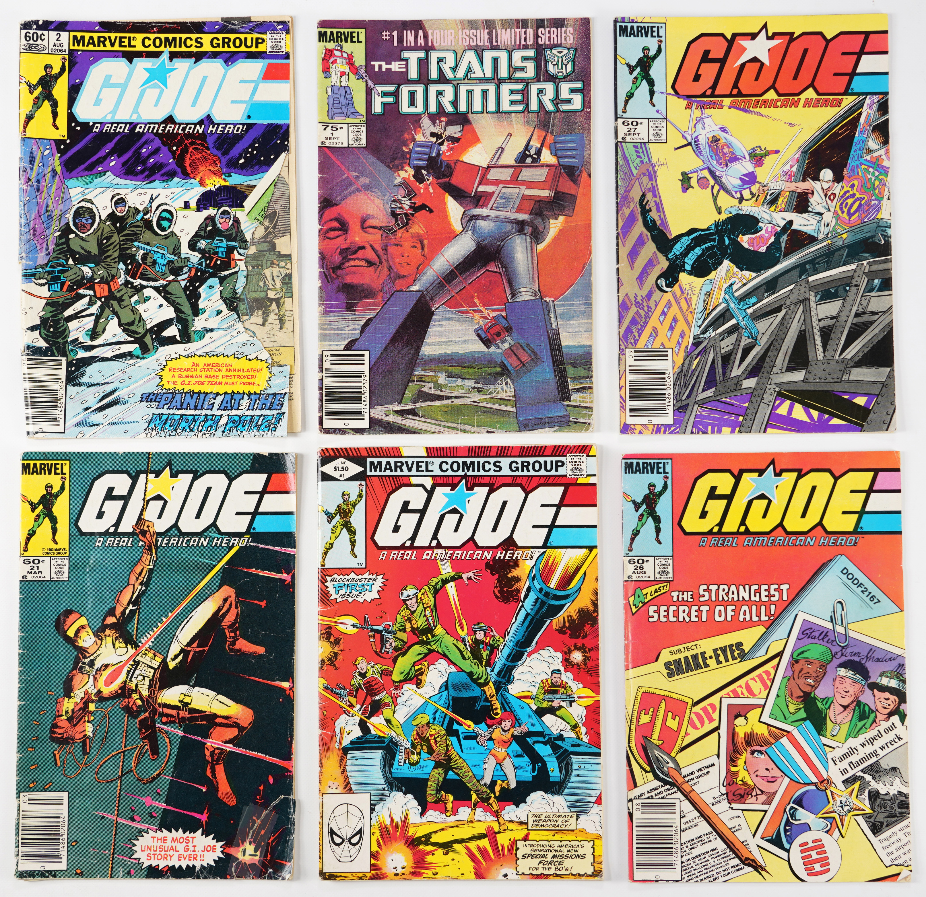 1982-1990 Marvel G.I. Joe, A Real American Hero (81) with issue numbers: 1 inaugural issue VG-FN, 2 first Kwinn FR, 3, 12, 16 first Cover Girl and Trip-Wire, 18, 19, 21 silent issue, first Storm Shadow GD, tape repair, 22 first Duke and Roadblock, 23, 24, 25 first full Zartan, first Cutter, Deep Six, Mutt, Junkyard, and Dreadnoks, 26 origin of Snake Eyes Part 1 (2), 27 origin of Snake Eyes Part 2, 28 (2), 29 (2), 30 (2), 31, 32, 33, 34, 35, 36, 37, 38, 39, 40, 41, 42, 43, 44, 45, 46, 47, 48 first Sgt. Slaughter, 49, 50, 51, 52, 53, 54, 55, 56, 57, 58, 59, 60 Todd McFarlane art, 61, 62, 63, 64, 65, 66, 67, 68, 69, 70, 71, 72, 73, 74, 75, 76, 77, 78, 79, 80, 81, 86, 93 Snake Eyes face revealed for the first time, 94, 95, 96, 100; and Yearbooks: 1, 3, 4.
