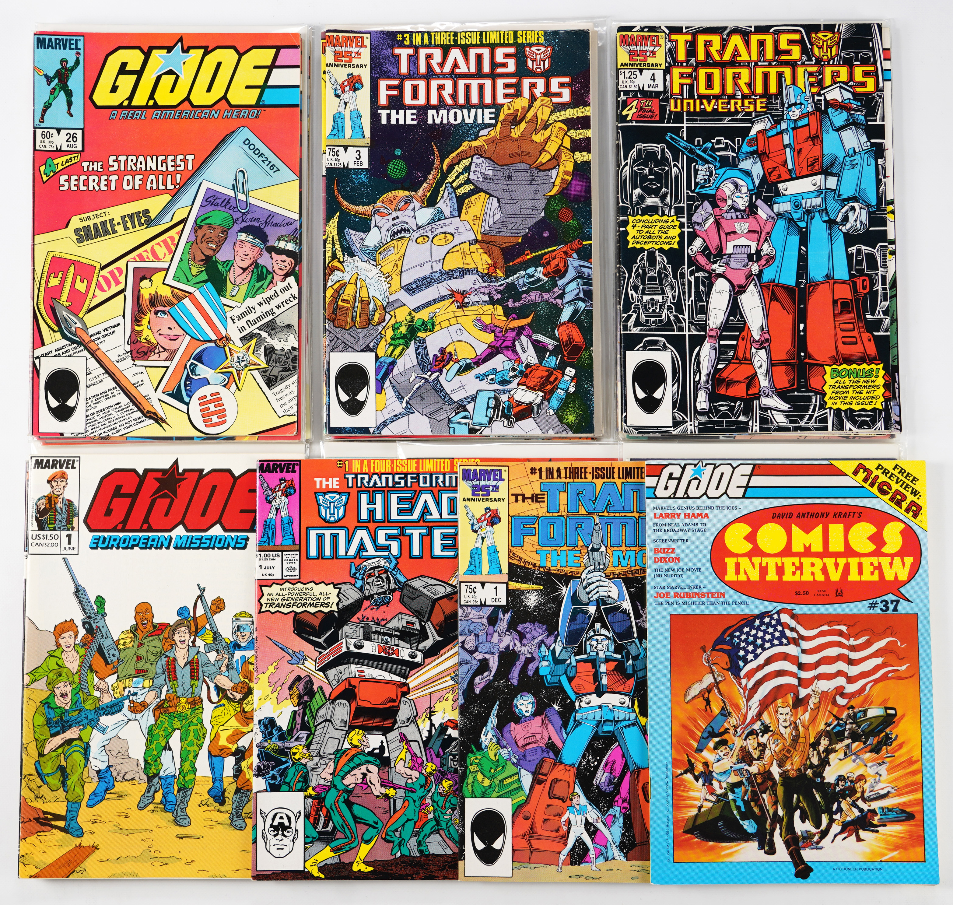1984-1989 Marvel The Transformers (23): 1 VG, 2, 3 Spider-Man black costume cover/appearance, 4, 5, 6 first Josie Beller, 7, 8 first full Dinobots, 9, 10, 14, 15, 16 Plight of the Bumblebee, 17, 18, 19 first Omega Supreme, 20, 21, 22, 23, 24, 53 Jim Lee cover, 54.