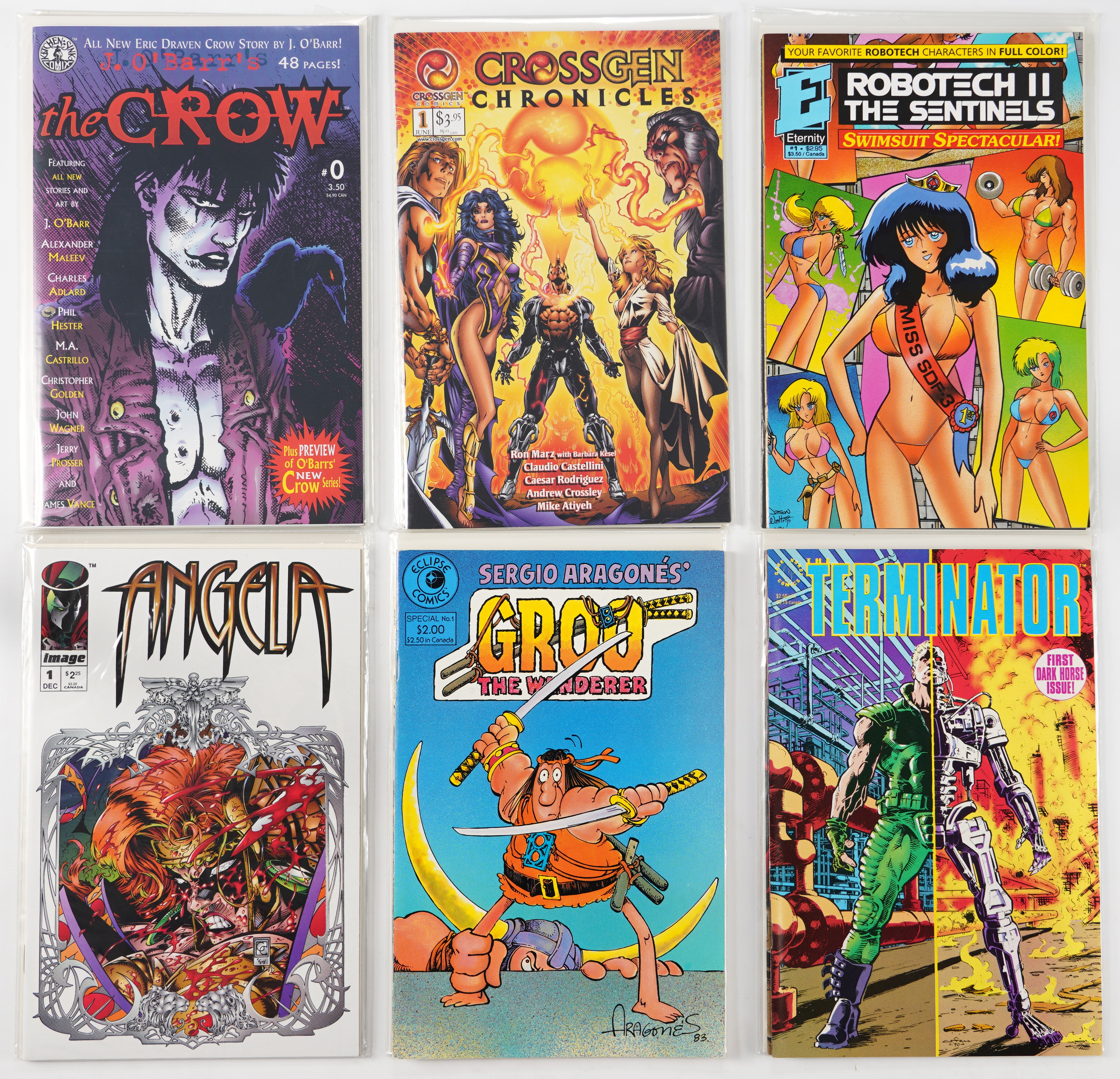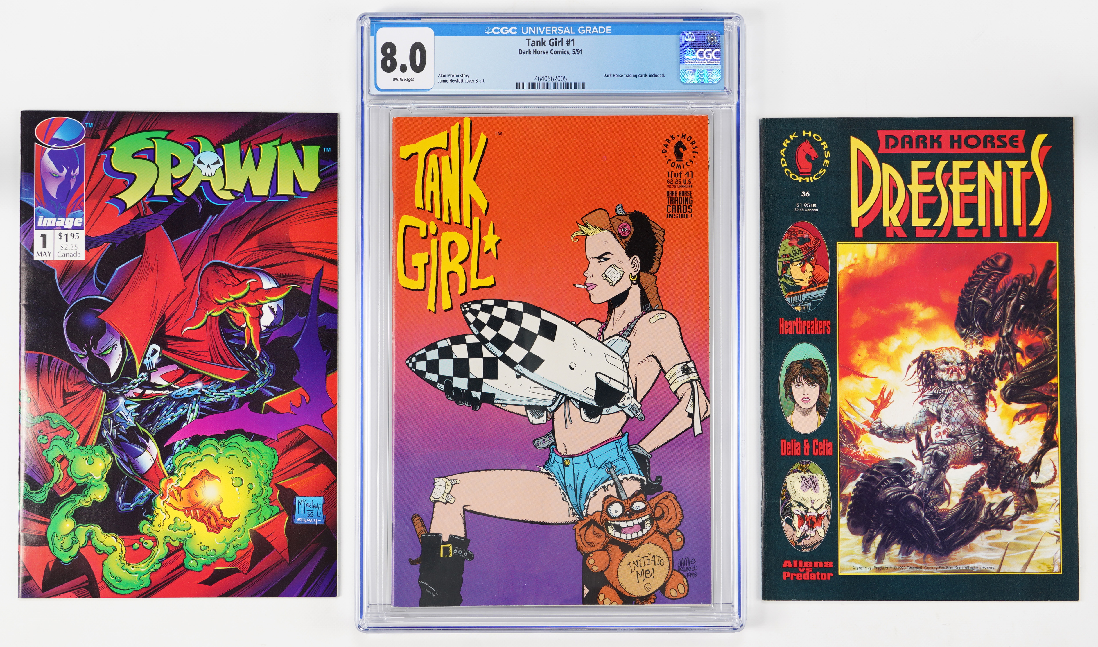 Venture deep into the realm of independent comics, with this 1980s-2000s collection (480+). Headlining this beefy bundle are considerable selections of Image and Dark Horse titles, along with many assorted Robotech titles from a variety of publishers. Top prize goes to 1991 Dark Horse Tank Girl issue, which is CGC graded 8.0, White Pages. Other gems are a run of the first (26) Image Spawn issues, the complete Image Angela (3) issue run, and Dark Horse Presents #36 first Aliens vs. Predator with variant cover. Other popular characters and titles of note are the Crow, Areala Warrior Nun, Aria, Gen 13, Aliens vs. Predator, Groo, Terminator, and Witchblade. Also worth noting are the many complete runs present. Condition is generally sharp, ranging 90% VF-NM to NM+, 10% slightly lesser.