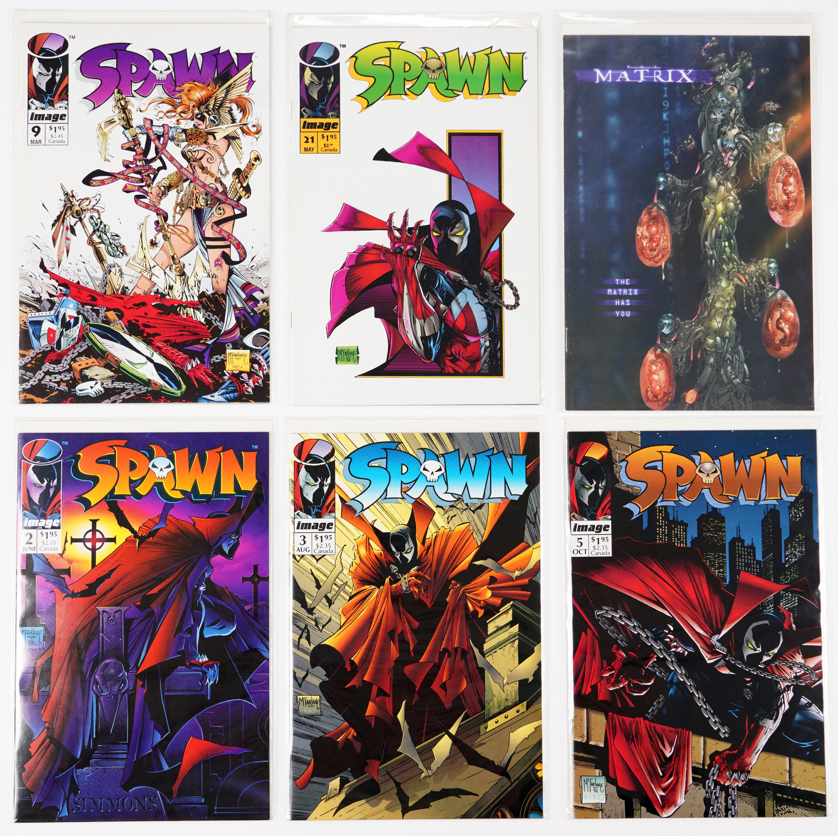 Spawn (27): #1 inaugural issue of first McFarlane Productions title, #2 first Violator, #3, #4 with coupon, #5 Cerebus cameo, #6, #7, #8, #9 first Angela, Neil Gaiman scripts, Jim Lee poster, #10 Superman cameo, #11, #12, #13, #14, #15, #16, #17, #18 low distribution, #19, #20, #21 low distribution, #22, #23, #24, #25, #26, #75;