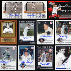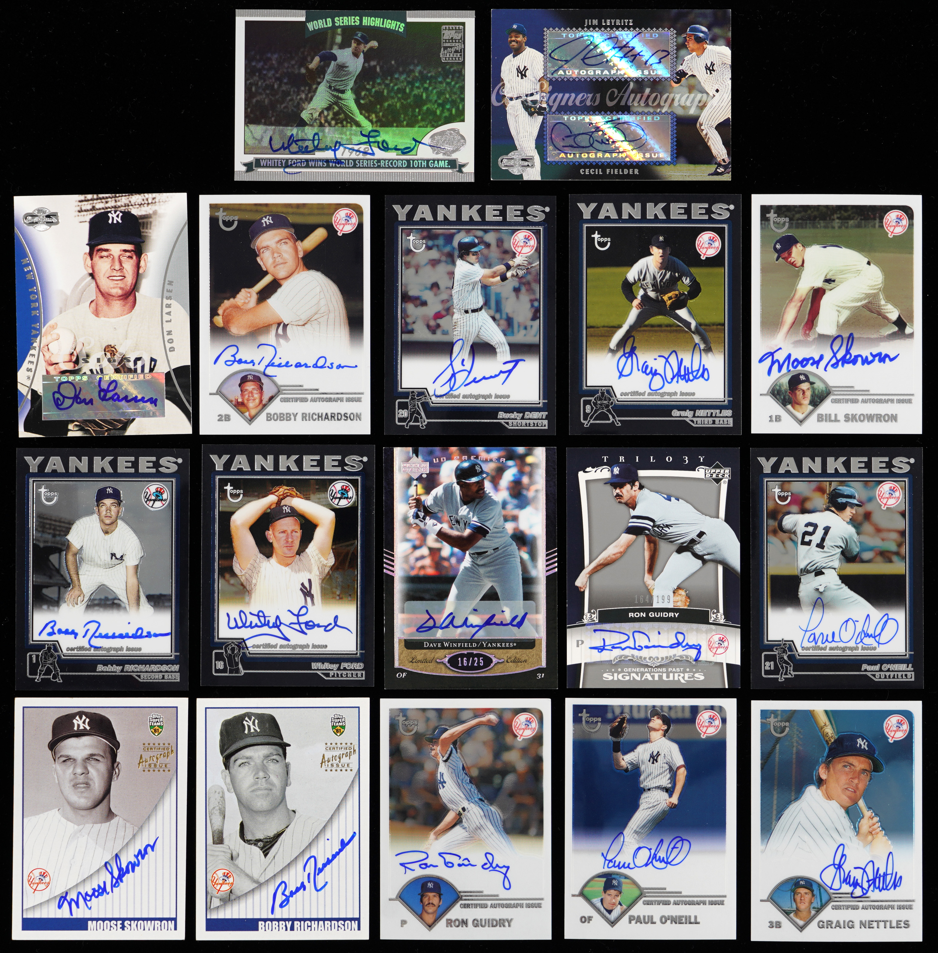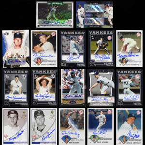 A bidding frenzy awaits the offered New York Yankees Hall of Fame and star certified autograph collection of (28) cards. Several of these modern inserts are numbered and come from various tiered subsets. Includes: 2001 Upper Deck Subway Series Heroes: (2 cards) with Ford, Larsen; 2002 Topps Super Teams Yankees: (3 cards) with Berra, Richardson, Skowron; 2003 Topps Retired Yankees: (9 cards) with Ford, Gossage, Guidry, Mattingly, Nettles, O'Neill, Richardson, Rizzuto, Skowron; 2004 Topps Retired Yankees: (7 cards) with Berra, Dent, Ford, Mattingly, Nettles, O'Neill, Richardson; 2006 Topps Co-Signers: (2 cards) with Larsen, Leyritz/C. Fielder; 2007 UD Premier: (2 cards, both #/25) with Berra, Winfield; Other Yankees: (3 cards) with 2004 Topps World Series Highlights Ford, 2005 Upper Deck Trilogy Guidry and 2011 Topps Diamond Anniversary M. Rivera (#/60, Happy 60th).