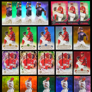 Topps Tribute Stephen Strasburg Near Rainbows: (39 cards) with 2011 Topps Tribute: (8 cards) with (3/4) #1/1 printing plates, #/10 black, #/50 gold, #/75 green, #/199 blue, base; 2013 Topps Tribute: (6 cards) with #1/1 printing plate, #/25 gold, #/50 orange (matches jersey number), #/75 green, #/99 blue, base; 2014 Topps Tribute: (6 cards) with #1/1 printing plate, #/5 red, #/25 gold, #/50 green, #/99 blue, base; 2015 Topps Tribute: (7 cards) with (3/4) #1/1 printing plates, #/10 purple, #/50 black, #/99 green, base; 2017 Topps Tribute: (4 cards) with #/10 red, #/50 purple, #/99 green, base; 2018 Topps Tribute: (4 cards) with #/10 red, #/50 purple, #/99 green (matches jersey number), base; 2021 Topps Tribute: (4 cards) with #/10 red, #/50 purple, #/99 green, base