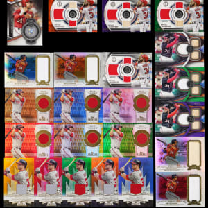 2018 Topps Tribute Triple Relic: (4 cards) with #/25 orange (three-color patch), #/50 purple, #/99 green, #/150 base;