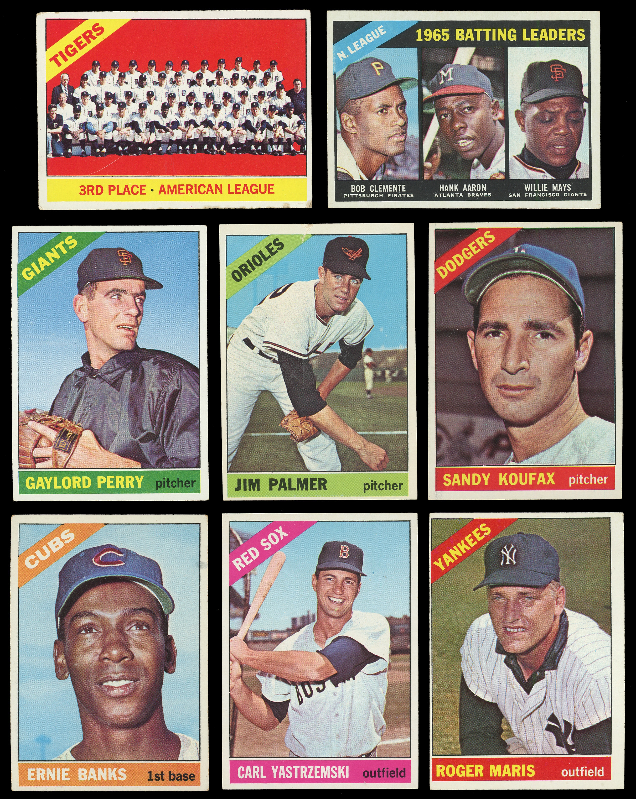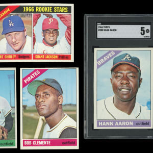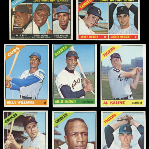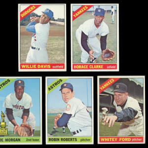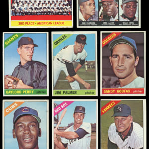 From the season in which the Baltimore Orioles swept the Los Angeles Dodgers four straight arrives this strong 1966 Topps near complete set of (563/598) cards. This particularly clean edition has an approximate condition breakdown of 20% (EX-MT or better), 30% (EX), 25% (VG-EX) and 25% (VG or lesser) with the tougher high series generally presenting similarly if not a touch better than the more available numbers. Highlights include: #1 Mays (GD), #30 Rose (EX), #70 Yastrzemski (EX-MT), #100 Koufax (VG-EX), #110 Banks (VG), #126 Palmer RC (VG), #160 Ford (VG-EX), #195 Morgan (EX), #215 N.L. Batting Leaders (VG-EX), #217 N.L. HR Leaders (EX-MT), #288 Sutton RC (EX-MT), #300 Clemente (VG-EX), #310 F. Robinson (EX), #365 Maris (VG), #390 B. Robinson (VG-EX), #410 Kaline (VG-EX), #469 Murcer RC (VG), #500 Aaron (SGC EX 5), #530 Roberts (EX), #535 W. Davis (VG-EX), #540 McLain (EX), #547 H. Clarke RC (EX), #550 McCovey (VG), #565 Piersall (EX-MT), #567 Howser (EX), #580 B. Williams (EX-MT), #583 Tigers Team (GD), #590 Skowron (EX-MT), #591 G. Jackson RC (VG-EX) and #598 Perry SP (EX).