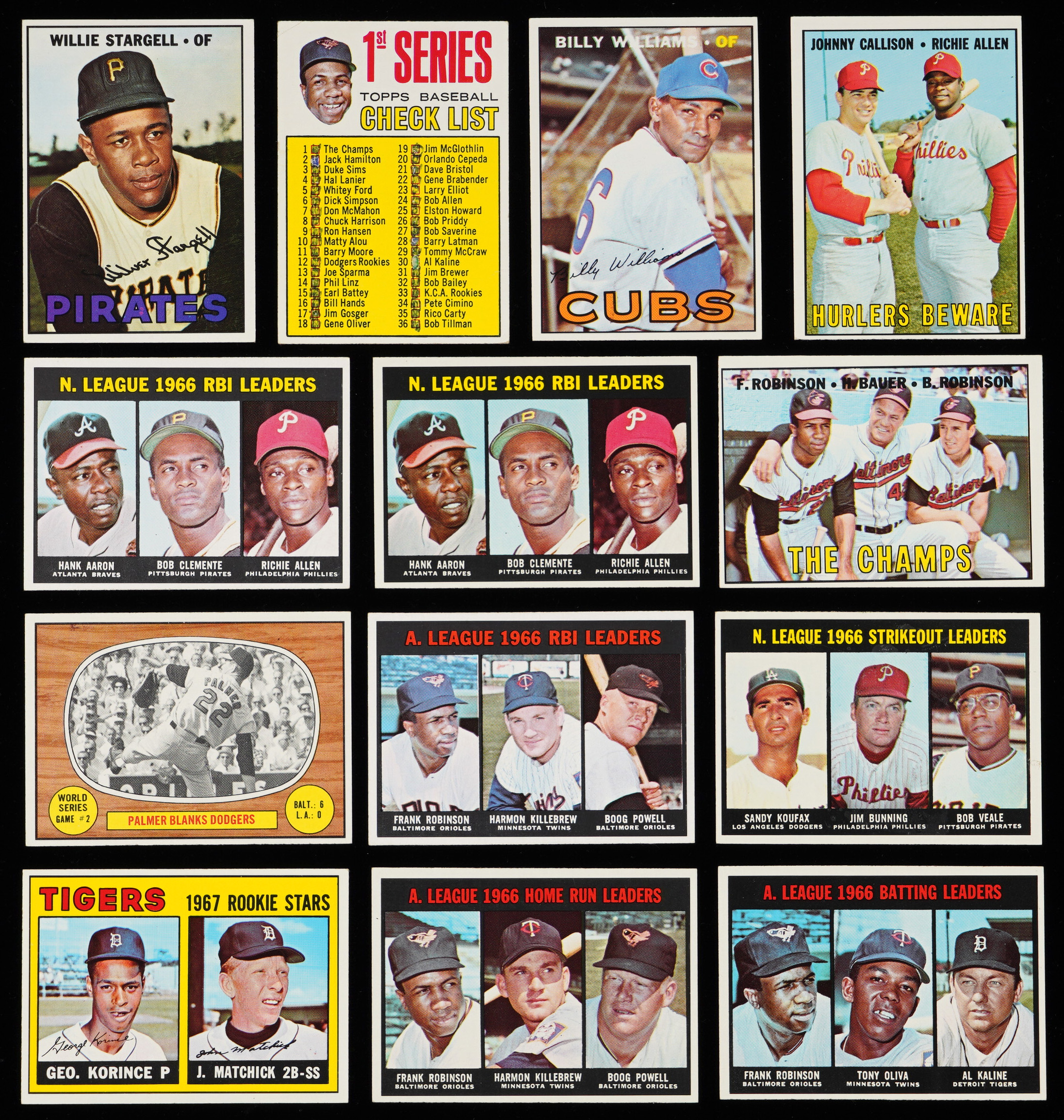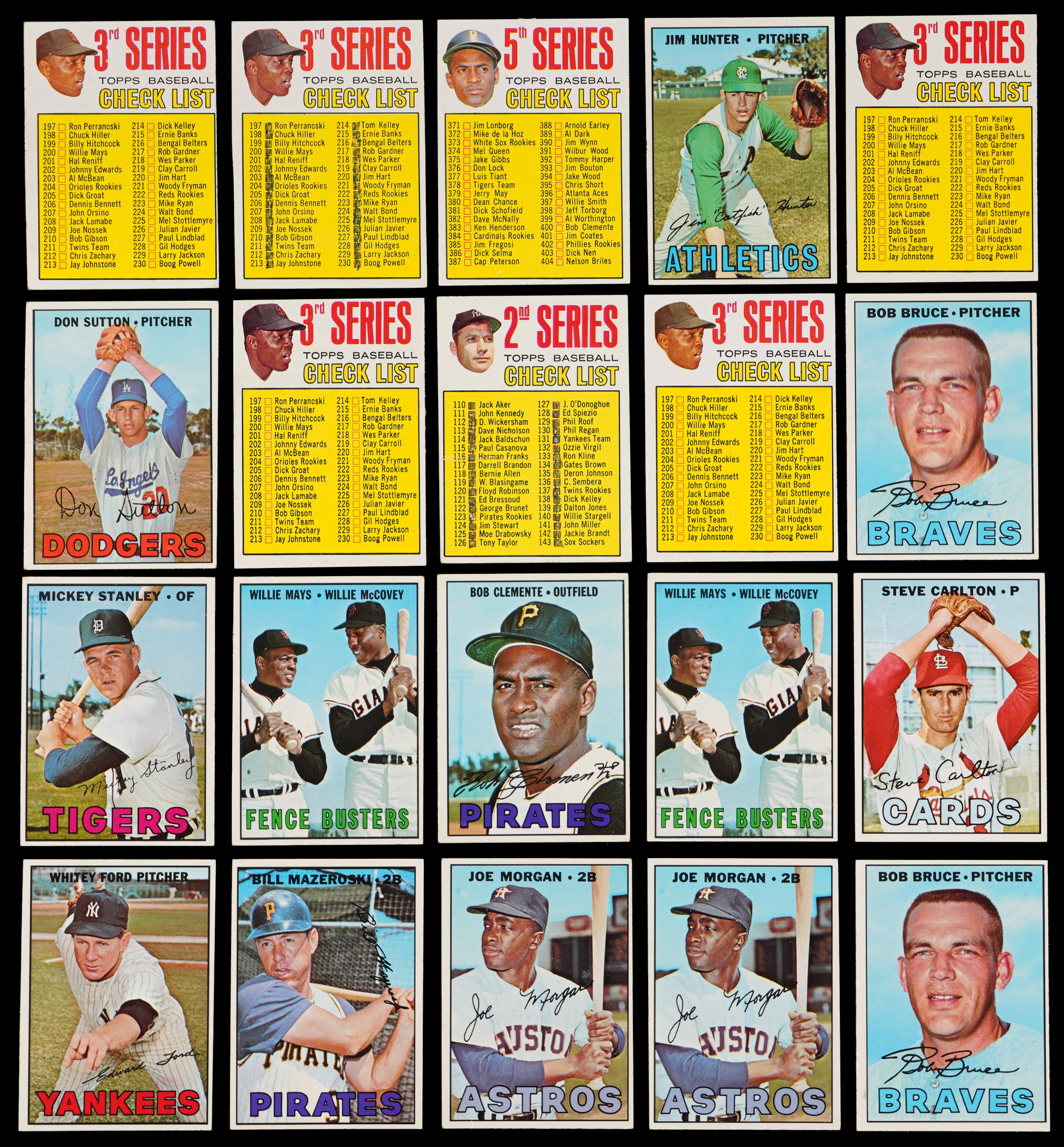 Sizable 1967 Topps collection of (500+) cards featuring a partial set of (311/609) cards including (50+) Hall of Famers and (22) high numbers. This fresh compilation generally presents in the (EX to EX-MT) range with the duplicates presenting only a touch lesser. Highlights include: #1 The Champs (VG), #5 Ford (EX-MT), #103 Mantle CL (marked), #146 Carlton (EX-MT), (5) #191 Mays CL (average VG with 20% marked), (2) #337 Morgan (both VG), #400 Clemente (VG), (2) #417 Bruce ERR (both EX), (2) #423 Mays/McCovey (both EX), #445 Sutton (FR), #510 Mazeroski (EX) and #607 Stanley (VG-EX).