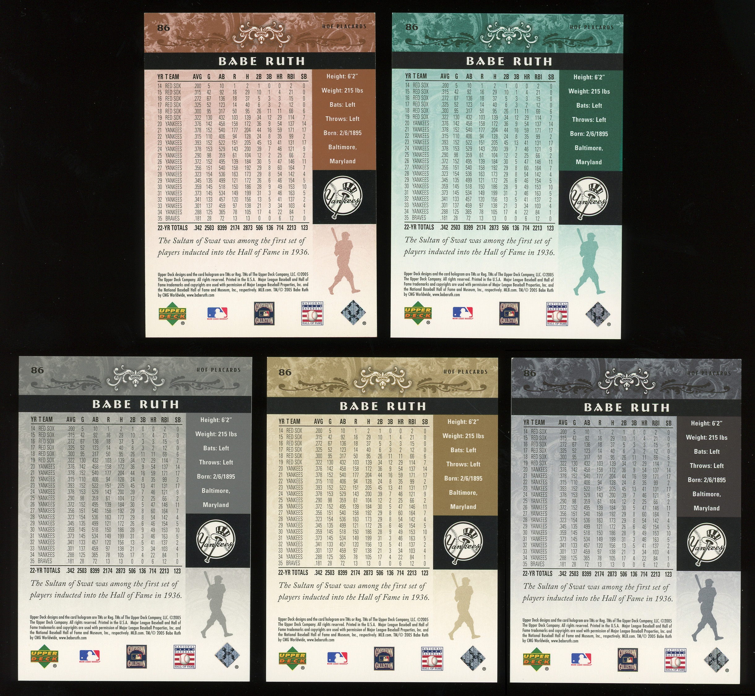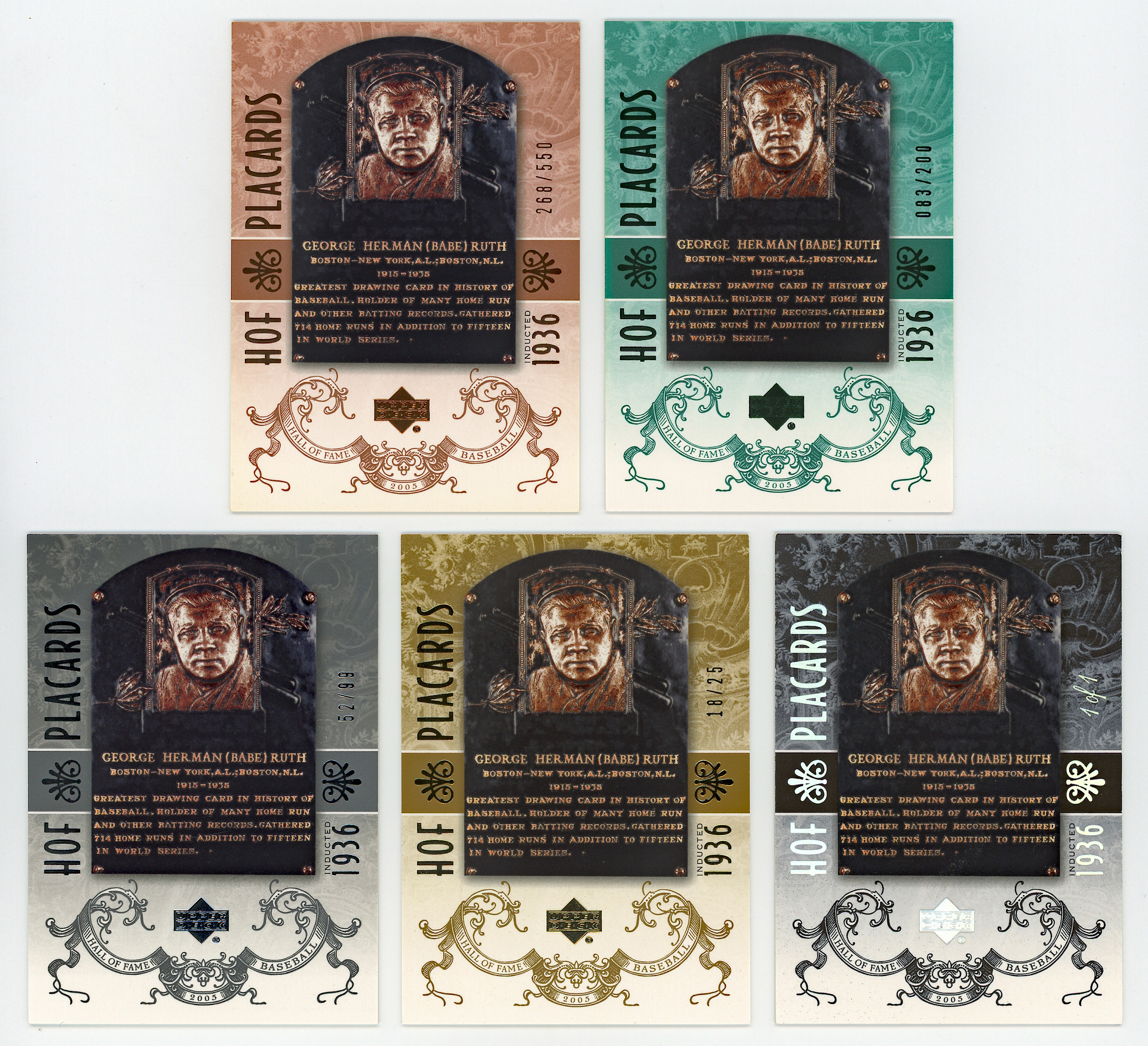 Induct the offered 2005 Upper Deck Hall of Fame #86 Babe Ruth complete rainbow of five cards into your modern insert collection. The following HOF Placards variations are included: #1/1 rainbow, #/25 gold, #/99 silver, #/200 green and #/550 base.
