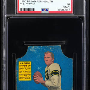 Graded POOR 1 by PSA with an (mc) qualifier. Portrayed as the signal caller for the first incarnation of the Baltimore Colts, Y.A. Tittle is the subject of the offered 1950 Bread for Health label. By all accounts a rookie specimen, this scarce die-cut collectible is among the toughest in the regional set of 32 players. Coveted in any condition, this Hall of Fame example presents nicely with only mild wrinkling inherent to the packaging and vibrant colors. Only 4 total copies of this rarity have been judged in any condition. Part of a 1950 Bread for Health Football bread label near set break. Each non-Hall of Famer has a total census of 5 or lesser with the majority being the highest graded.