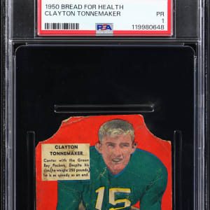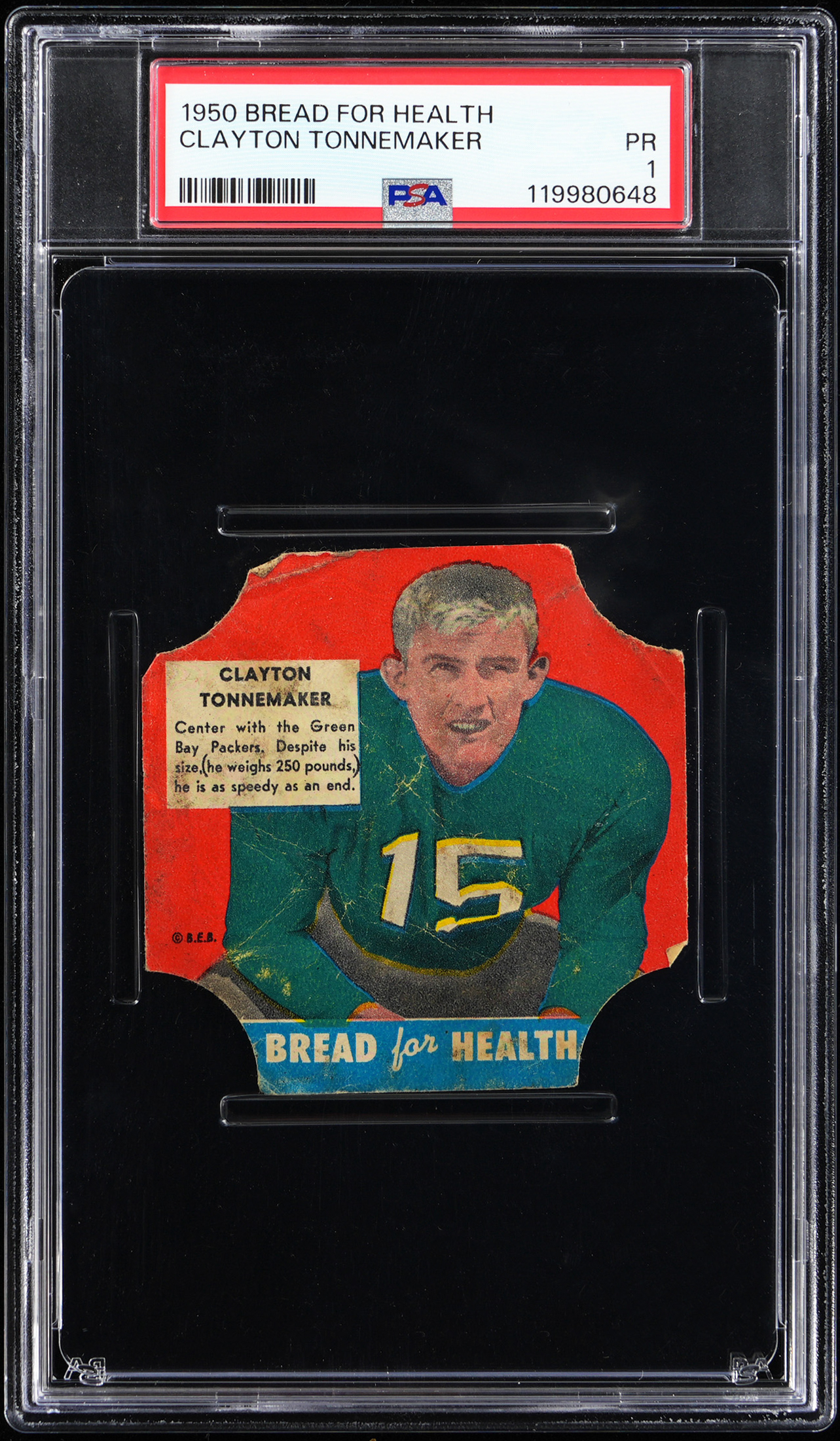 Graded POOR 1 by PSA. Green Bay Packers player and College Football Hall of Famer Clayton Tonnemaker. Total population: 3. Part of a 1950 Bread for Health Football bread label near set break. Each non-Hall of Famer has a total census of 5 or lesser with the majority being the highest graded.
