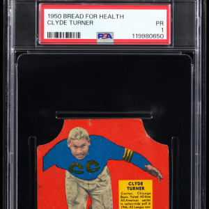 Graded POOR 1 by PSA. Chicago Bears Hall of Famer Clyde (Bulldog) Turner was a terror on both sides of the ball for the "Monsters of the Midway." The native Texas appears on a collision course with the offered 1950 Bread for Health label. Only 5 total copies of this die-cut rarity have been judged in any condition. Part of a 1950 Bread for Health Football bread label near set break. Each non-Hall of Famer has a total census of 5 or lesser with the majority being the highest graded.