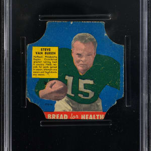Graded POOR 1 by PSA with an (mc) qualifier. Philadelphia Eagles Hall of Famer (Supersonic) Steve Van Buren was a driving force for the franchise's back-to-back NFL titles as the close of the 1940s. The determined halfback scores again with the offered 1950 Bread for Health label. Only 5 total examples of this near impossible die-cut have been judged by the grading company. Part of a 1950 Bread for Health Football bread label near set break. Each non-Hall of Famer has a total census of 5 or lesser with the majority being the highest graded.