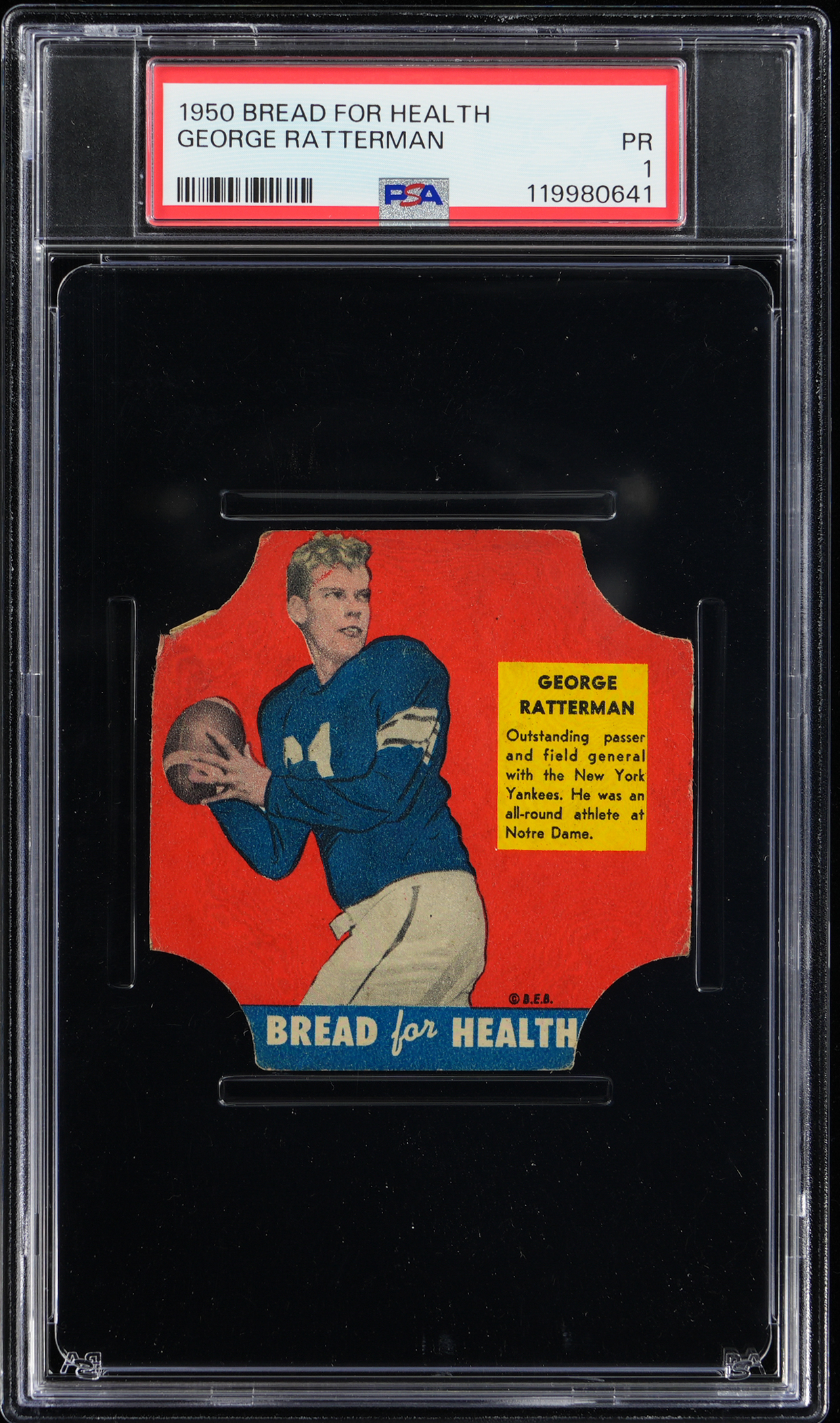 Graded POOR 1 by PSA. New York Yankees (AAFC) quarterback George Ratterman. Total population: 3. Part of a 1950 Bread for Health Football bread label near set break. Each non-Hall of Famer has a total census of 5 or lesser with the majority being the highest graded.