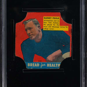 Graded POOR 1 by PSA. New York Yankees (AAFC) player and College Football Hall of Famer Barney Poole. Total population: 4. Part of a 1950 Bread for Health Football bread label near set break. Each non-Hall of Famer has a total census of 5 or lesser with the majority being the highest graded.