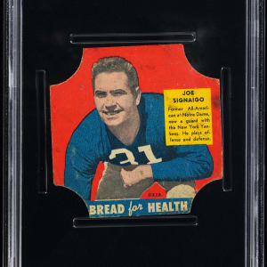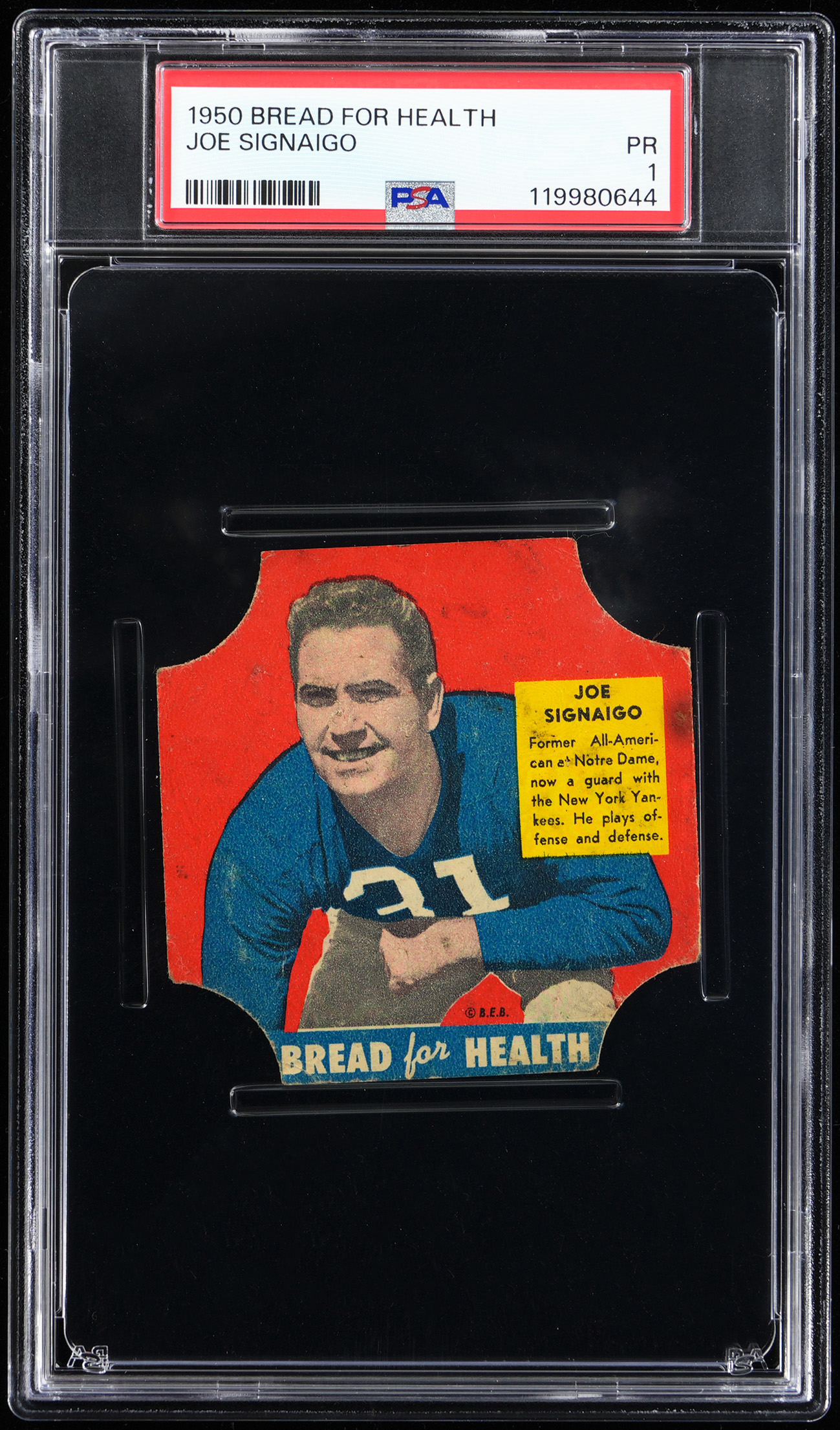 Graded POOR 1 by PSA. New York Yankees (AAFC) player Joe Signaigo. Total population: 3. Part of a 1950 Bread for Health Football bread label near set break. Each non-Hall of Famer has a total census of 5 or lesser with the majority being the highest graded.