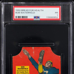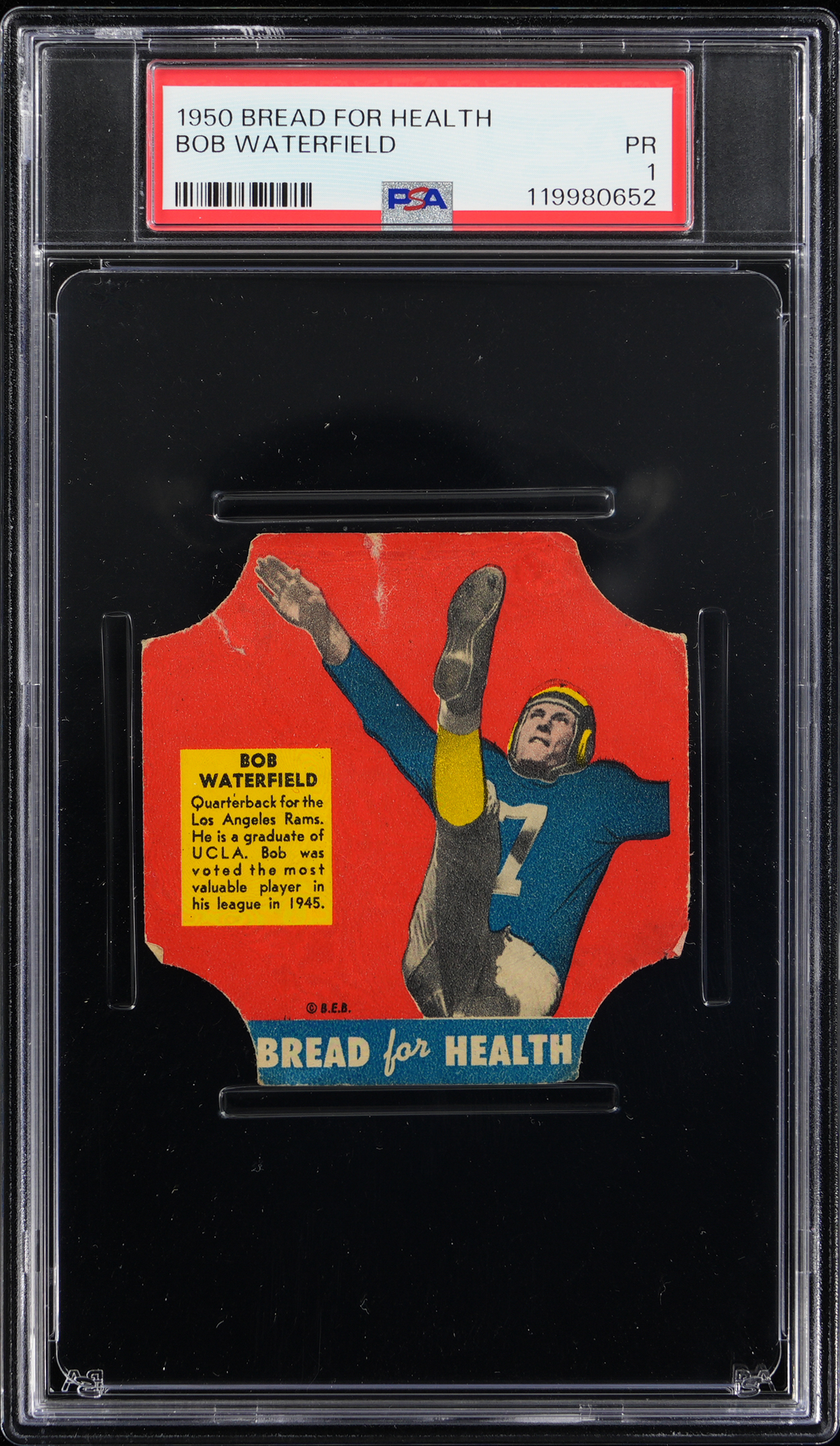 Highest Graded! Graded POOR 1 by PSA. The multi-talented Bob Waterfield showcases his kicking game on this elusive 1950 Bread for Health label. Only 4 total copies of this Los Angeles Rams Hall of Famer have been judged by the grading service. Part of a 1950 Bread for Health Football bread label near set break. Each non-Hall of Famer has a total census of 5 or lesser with the majority being the highest graded.