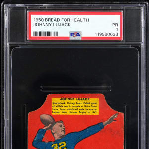 Graded POOR 1 by PSA. Notre Dame faithful will definitely feel "the luck of the Irish" upon scoring the offered 1950 Bread for Health Johnny Lujack label. Only 2 total copies of this 1947 Heisman Trophy winner have been judged by the grading service in any condition. Part of a 1950 Bread for Health Football bread label near set break. Each non-Hall of Famer has a total census of 5 or lesser with the majority being the highest graded.