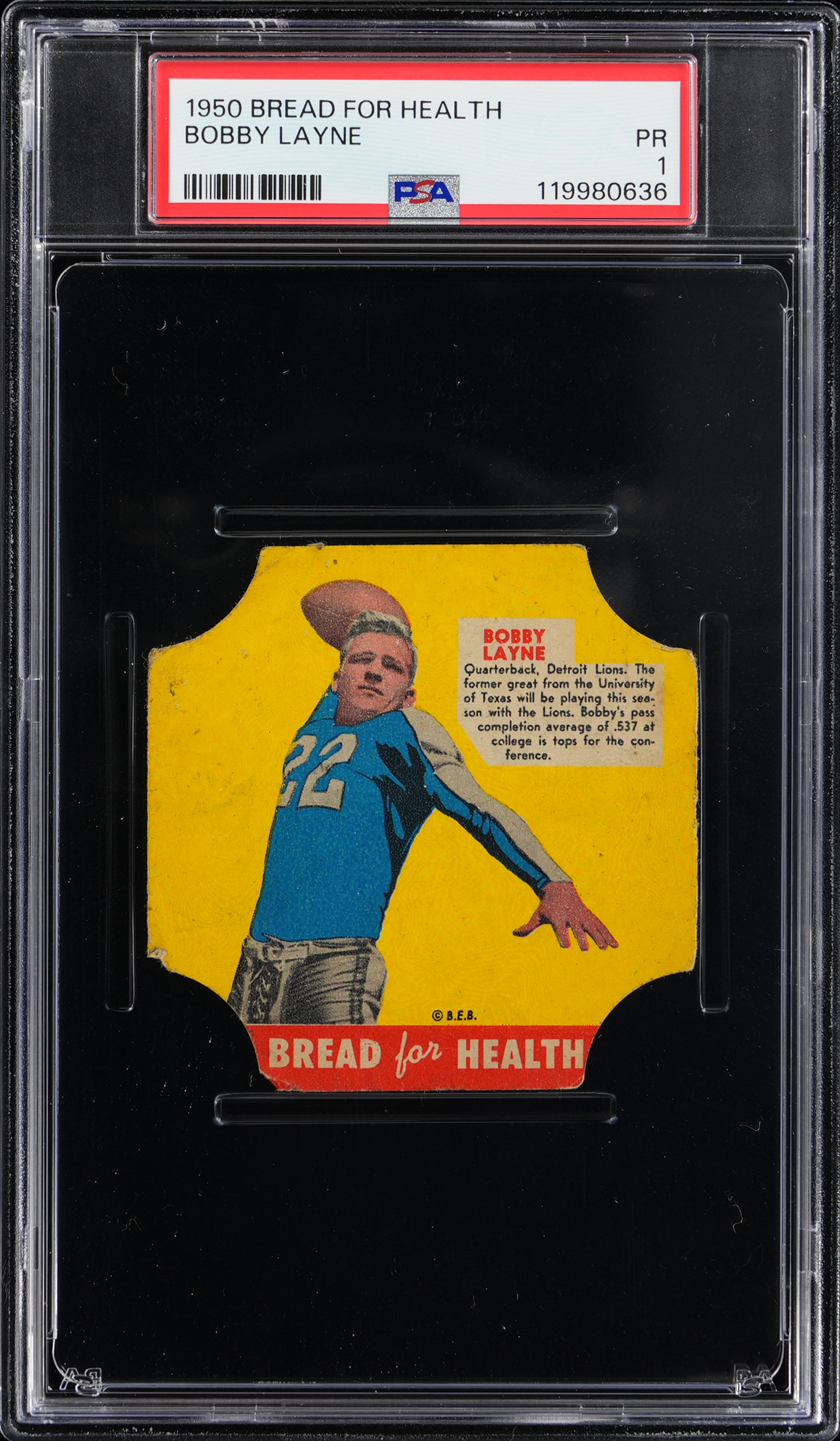 Graded POOR 1 by PSA. Incredibly scarce 1950 Bread for Health Football Bobby Layne label. Only 5 total copies of this fragile loaf end have been validated by the grading service. This delicate regional of "The Blonde Bomber" is amplified by bold surface colors along with intricately crafted player/uniform details. An especially fine rendition of the Detroit Lions Hall of Famer that is part of a 1950 Bread for Health Football bread label near set break. Each non-Hall of Famer has a total census of 5 or lesser with the majority being the highest graded.