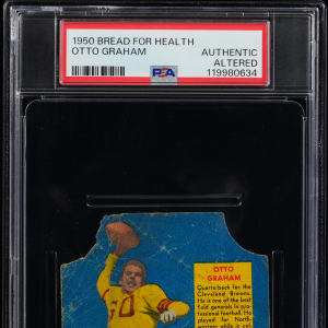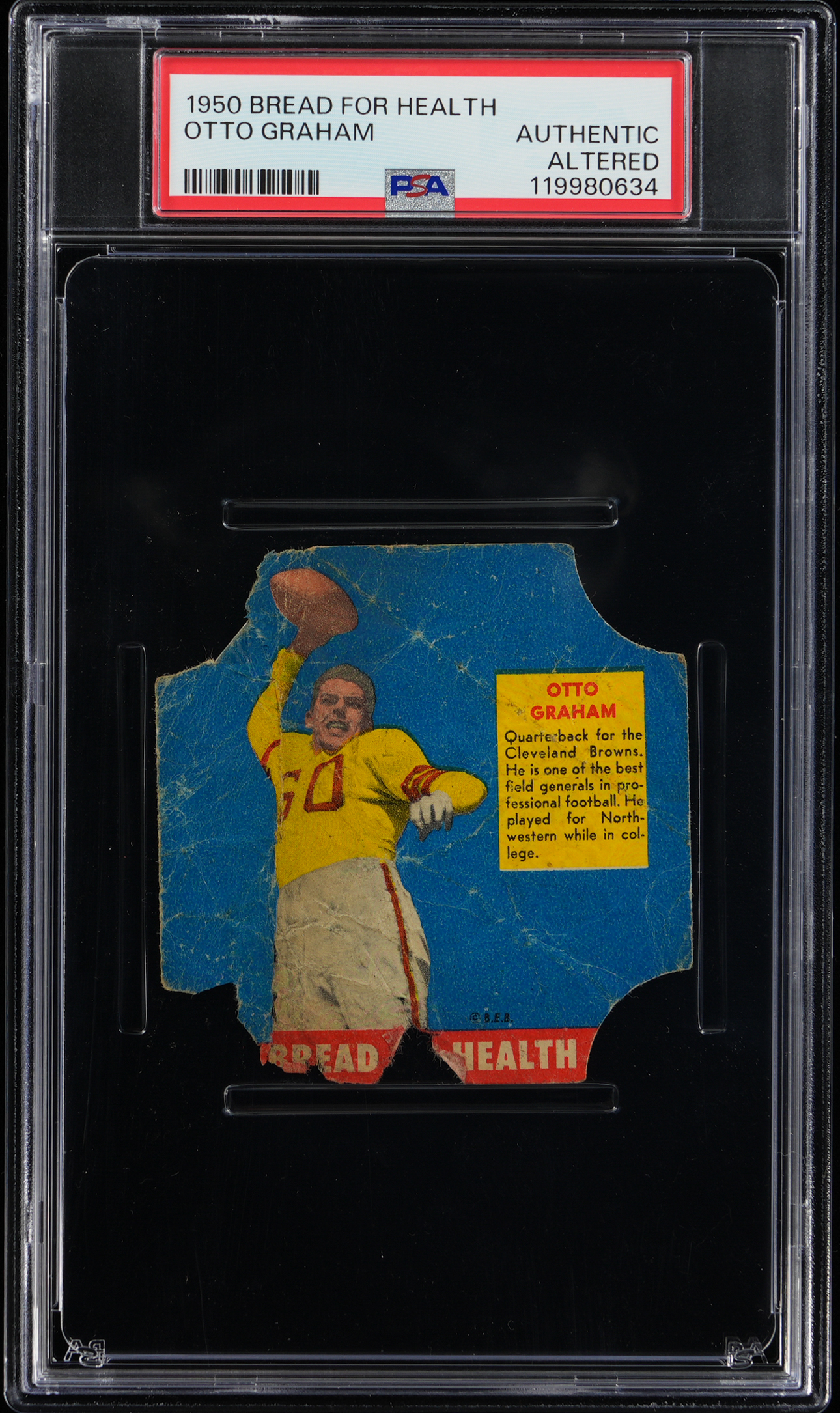 Canton Rookie! Graded Authentic (Altered) by PSA. Rookie regional of Cleveland Browns immortal Otto Graham. The record-shattering Hall of Famer drops back on this well-handled die-cut that has managed to survive the past 75 years in presentable condition. Despite a combination of acute wear, only 5 total copies of this seldom offered treasure have been assessed by the third-party grading service. Part of a 1950 Bread for Health Football bread label near set break. Each non-Hall of Famer has a total census of 5 or lesser with the majority being the highest graded.