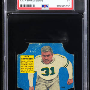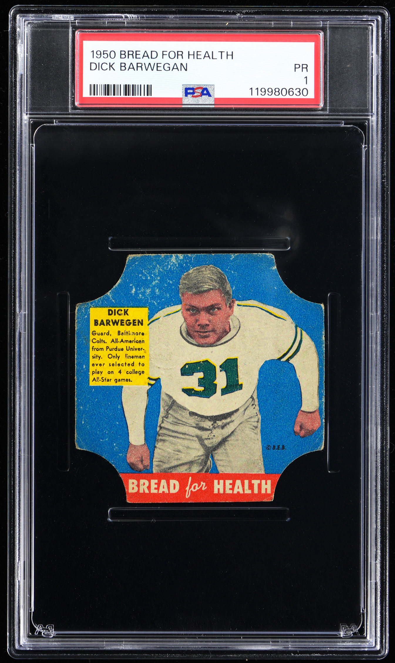 Graded POOR 1 by PSA. Baltimore Colts player Dick Barwegan. Total population: 4. Part of a 1950 Bread for Health Football bread label near set break. Each non-Hall of Famer has a total census of 5 or lesser with the majority being the highest graded.